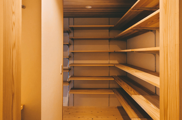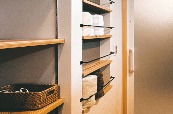 脱衣室には造作棚の他、ニッチ利用のタオル収納も設けています。