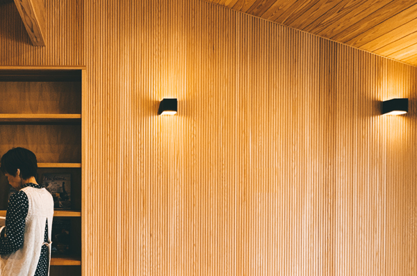 リビングの壁1面にストライプ状に加工した桧の板を貼りました。