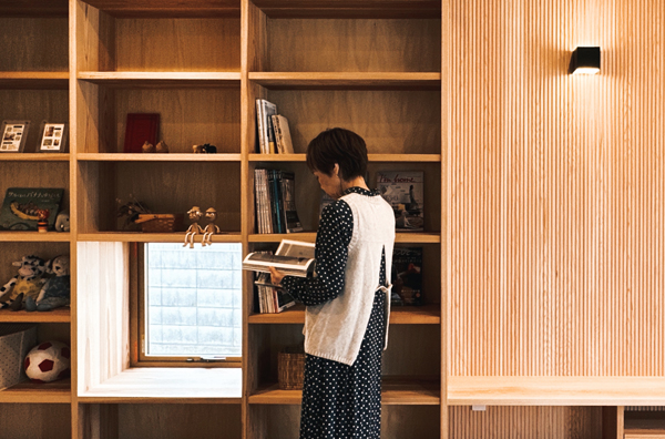 その一角には窓を組み込んだ大きな造作本棚を造り、家族のライブラリーコーナーになります。