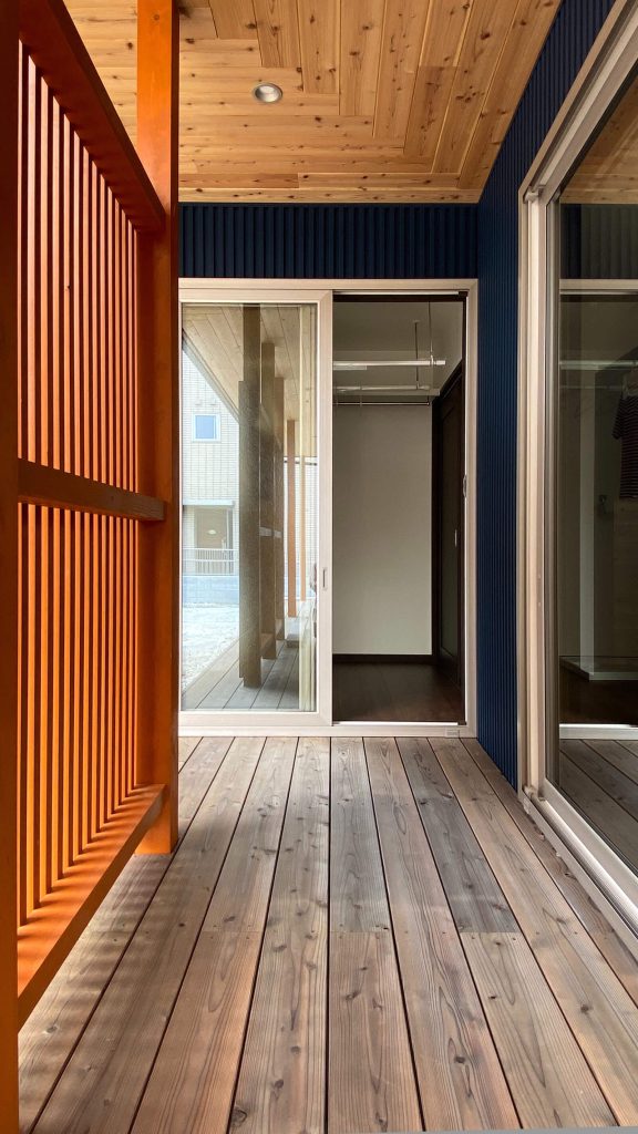 外干ししたい場合はそのまま屋根の掛かったウッドデッキに出られ、タテ格子によって干した物の目隠しもされています。