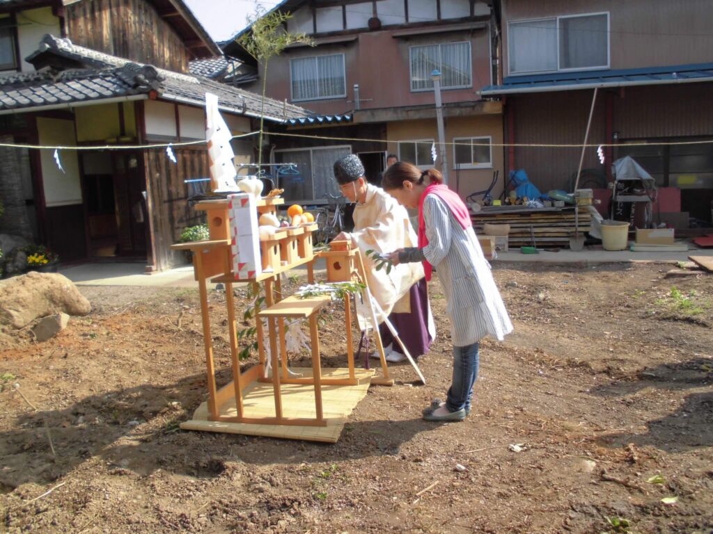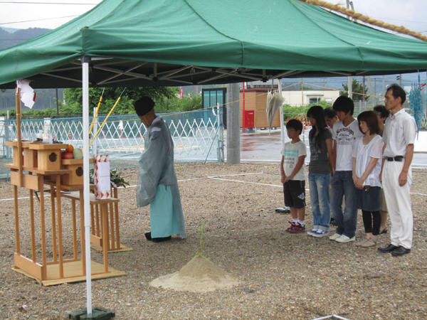 地鎮祭とは工事の前に、建築地の土地の神様に工事の安全と、建築後もその建物が何事もなく過ごせることをお願いする儀式になります。