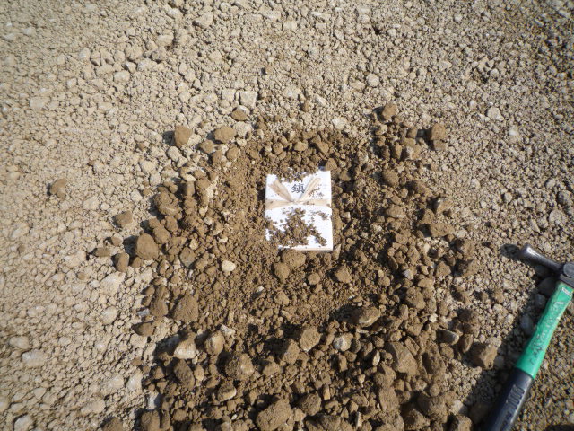 弊社の場合はうちでお預かりして、基礎工事の前に家の中心部分に埋めます。上の写真の中ほどの白い物が鎮め物になります。