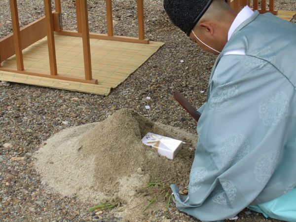 ・清祓い(きよはらい)の儀・・・上の写真が様子です。四方祓いとも言い、土地の四隅と中央に米・塩・酒をまいて清めます。