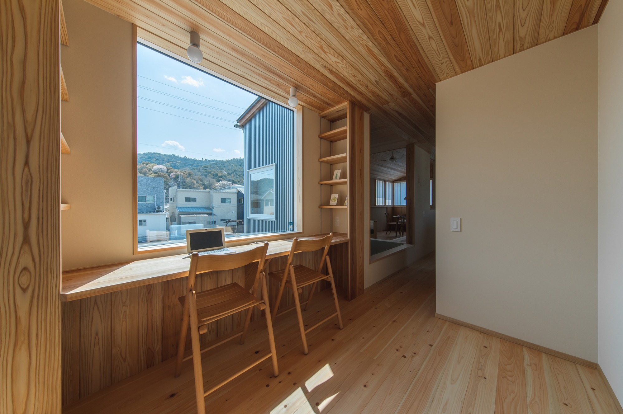 日中、素通しのガラスのままで過ごせる2階リビングは、遠くの山々を見渡せ快適な暮らしをもたらしてくれました。近くにあるマンションの上階は室内が分かるほどの距離ではなく、コの字の小さな庭に植えたシンボルツリーのアオダモが、2階に届くほど大きくなれば、窓から見える景色はより素敵なものなります。