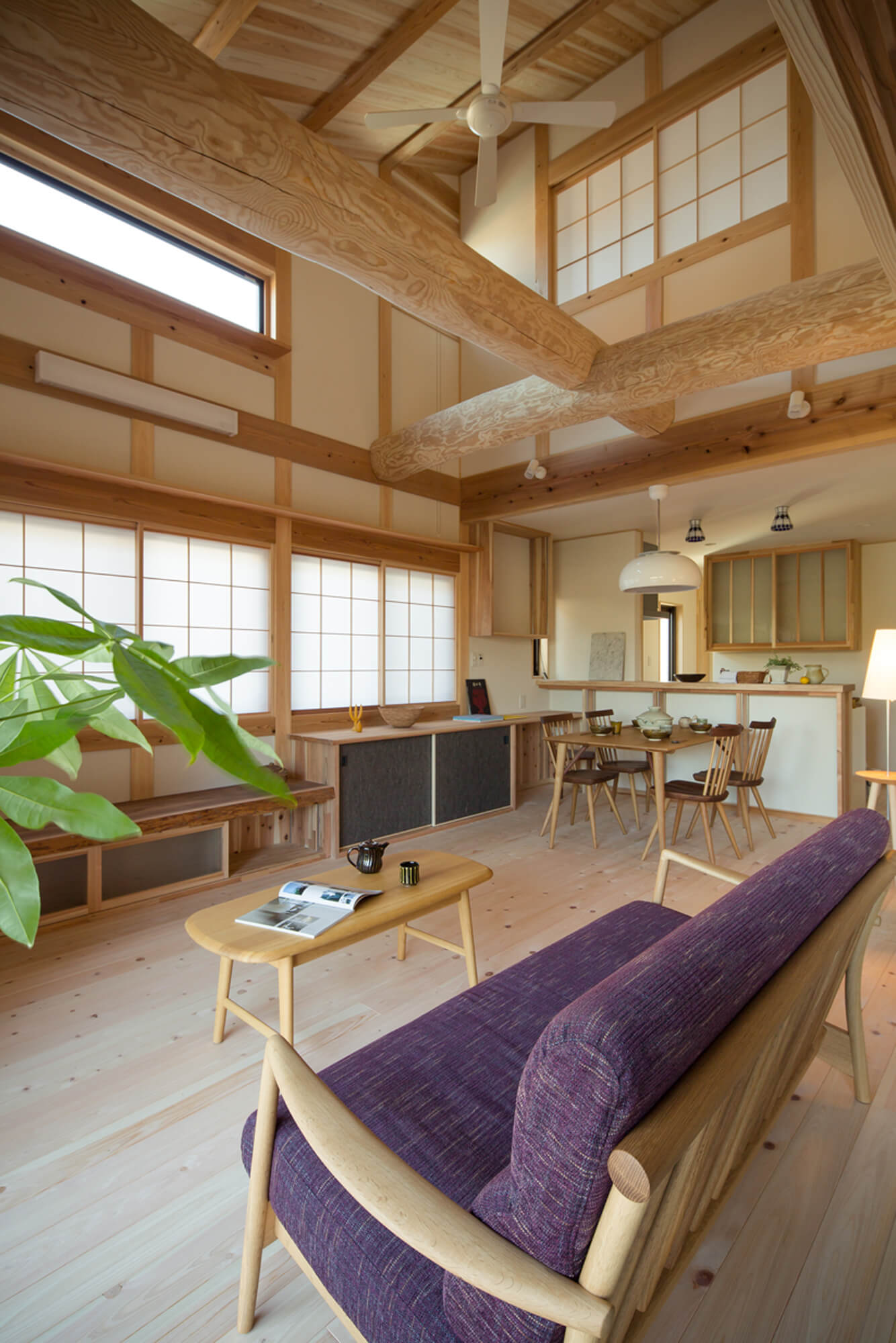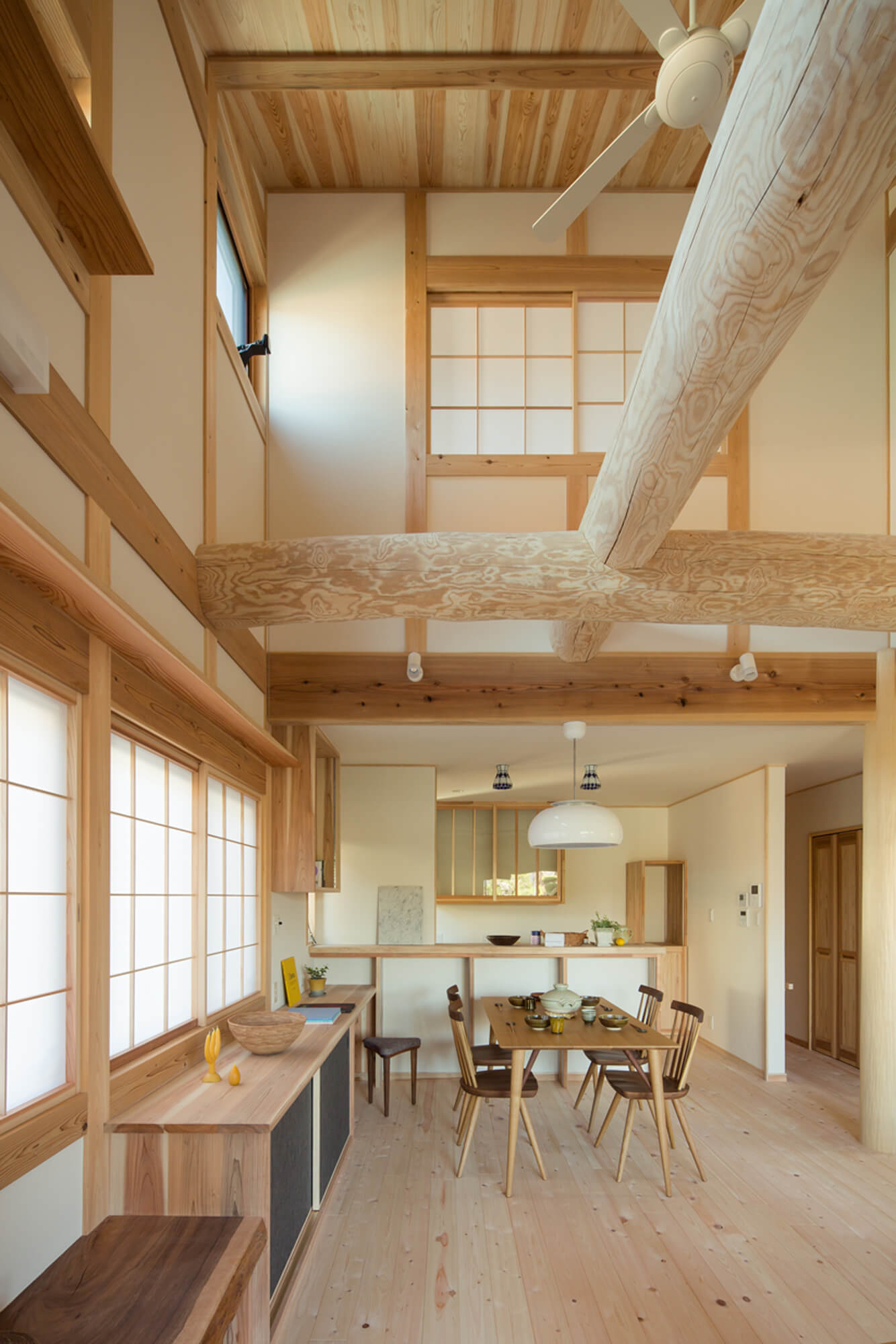 吹き抜けにかかった丸太梁が力強い印象の家です。1階に生活のすべてをまとめ、終の棲家として暮らせます