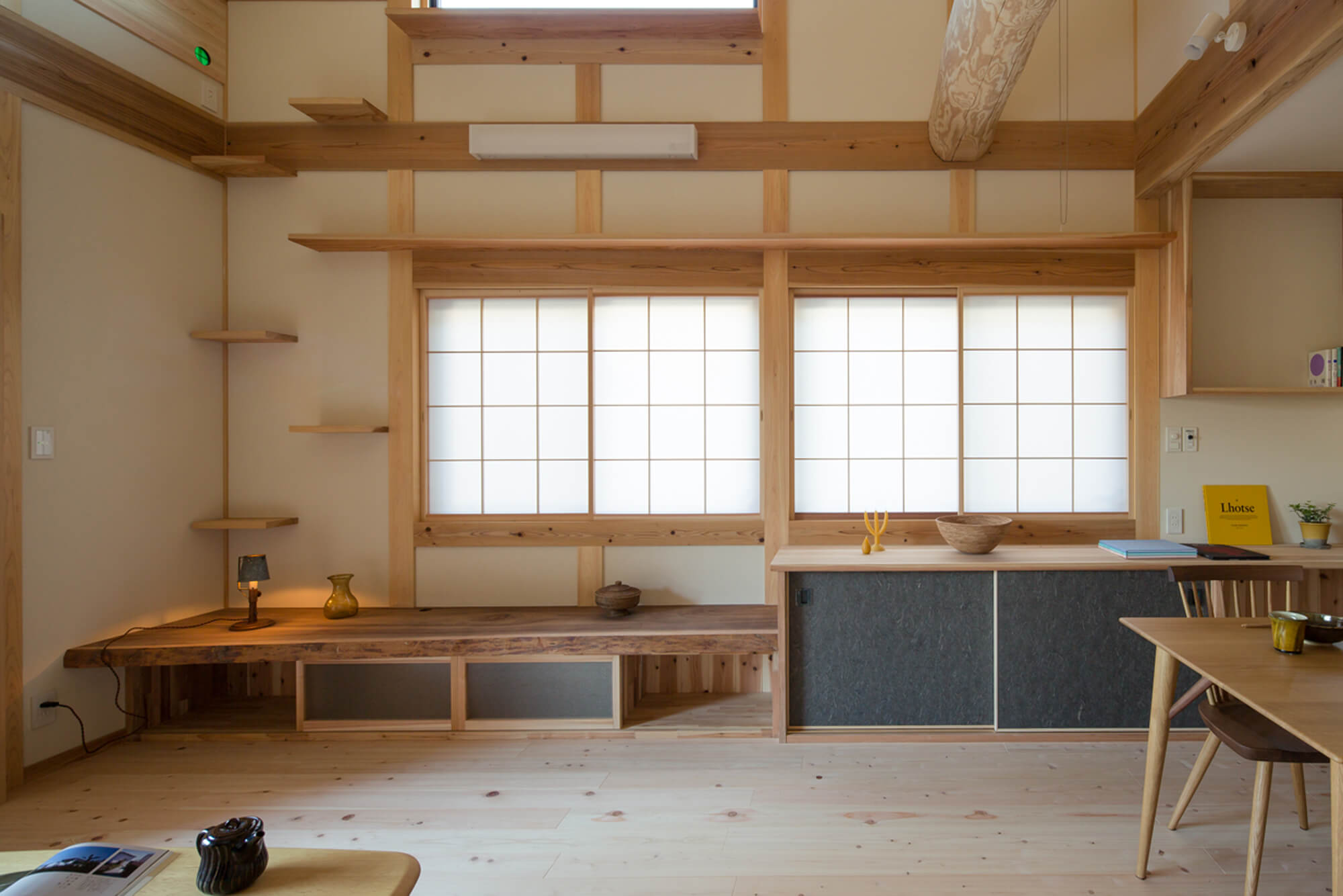 暑かろう寒かろうの旧来の家を建て替え、老後を安全に快適に生活できるようにしました。長く暮らせる家になるよう素材を吟味し、結果、外壁はそとん壁の塗り壁と木の組み合わせ、内装も体に優しい無垢床材や、珪藻土塗り壁を採用しています。将来にわたってなるべくメンテナンスにお金がかからないよう、あらかじめ考えて建てた家になります。
