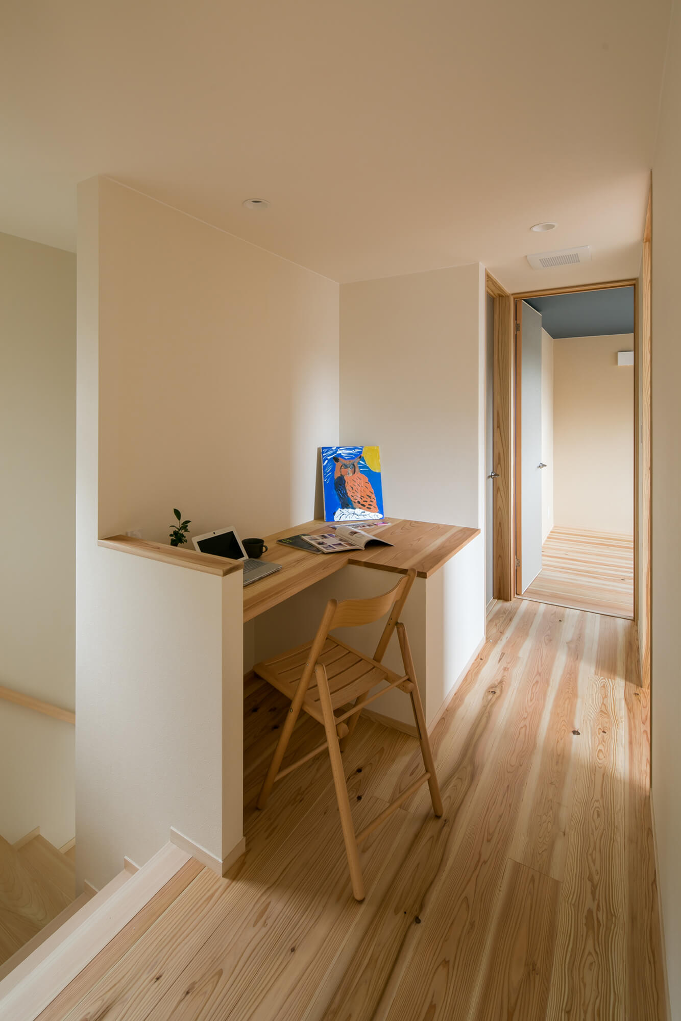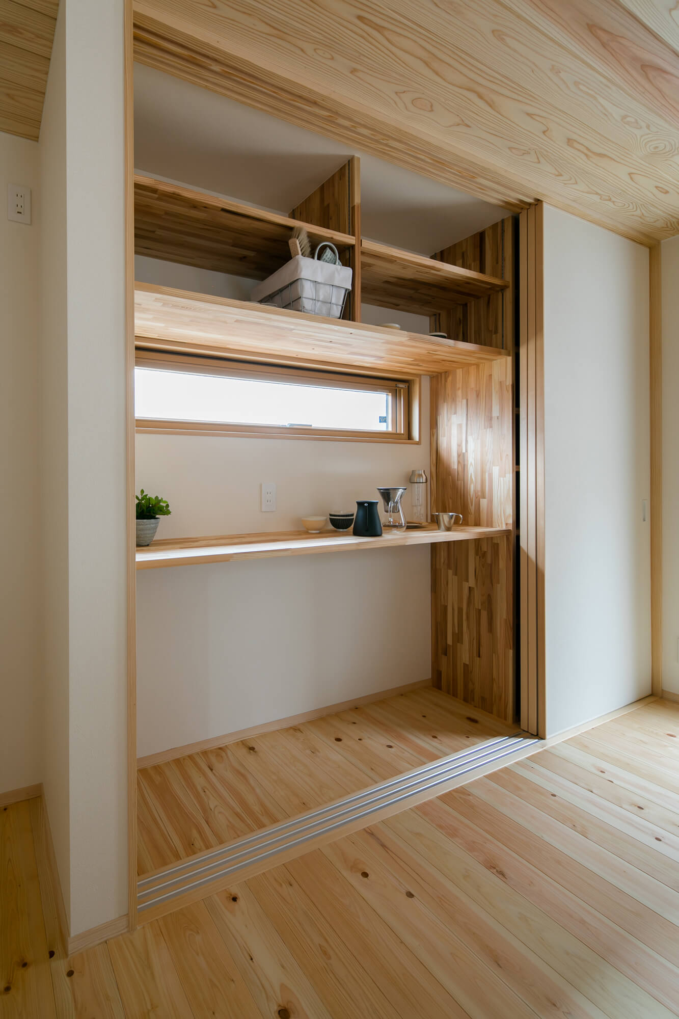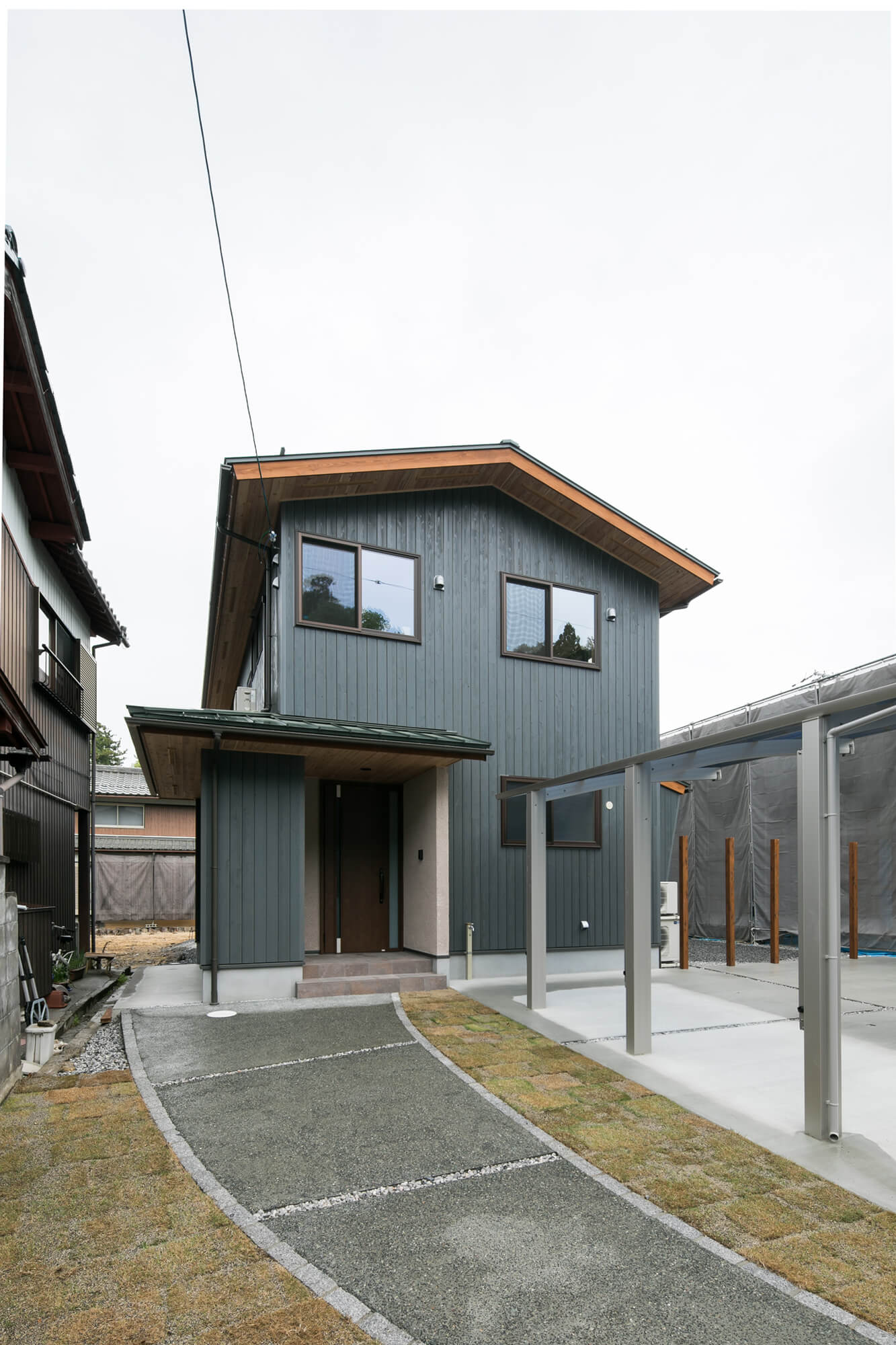 その街並みを壊すことのない外観はグリーンがかったグレーの杉羽目板と、ベージュのそとん壁で落ち着いた佇まいで作られています。決して大きな家ではありませんが、家族5人が互いの気配を感じられるような、暮らしやすい間取りになりました。全面に作られたウッドデッキはリビングに広がりを感じさせ、キッチン収納を全て目隠しするようにしたことで、雑然とした印象にはなりません。