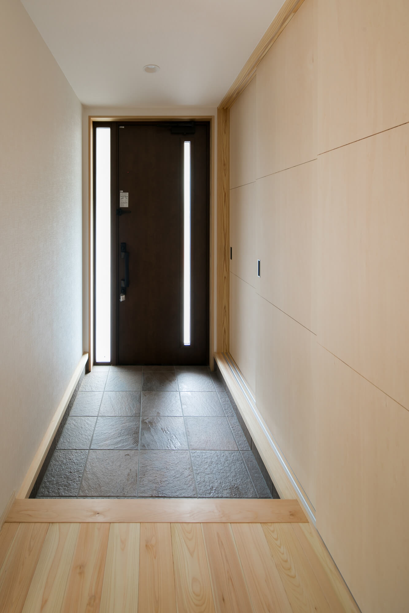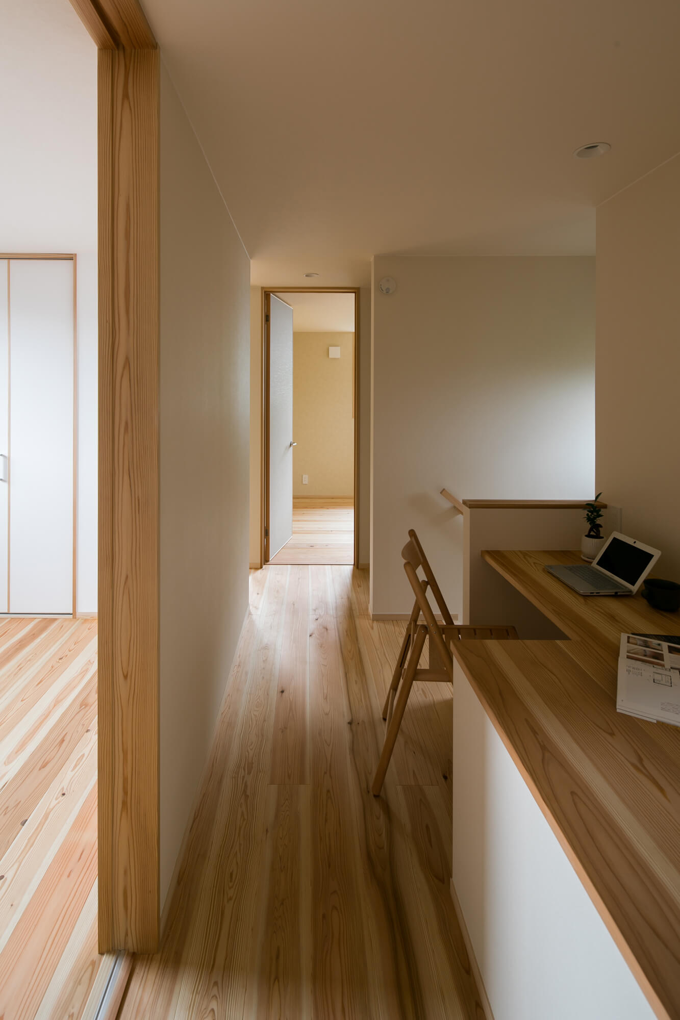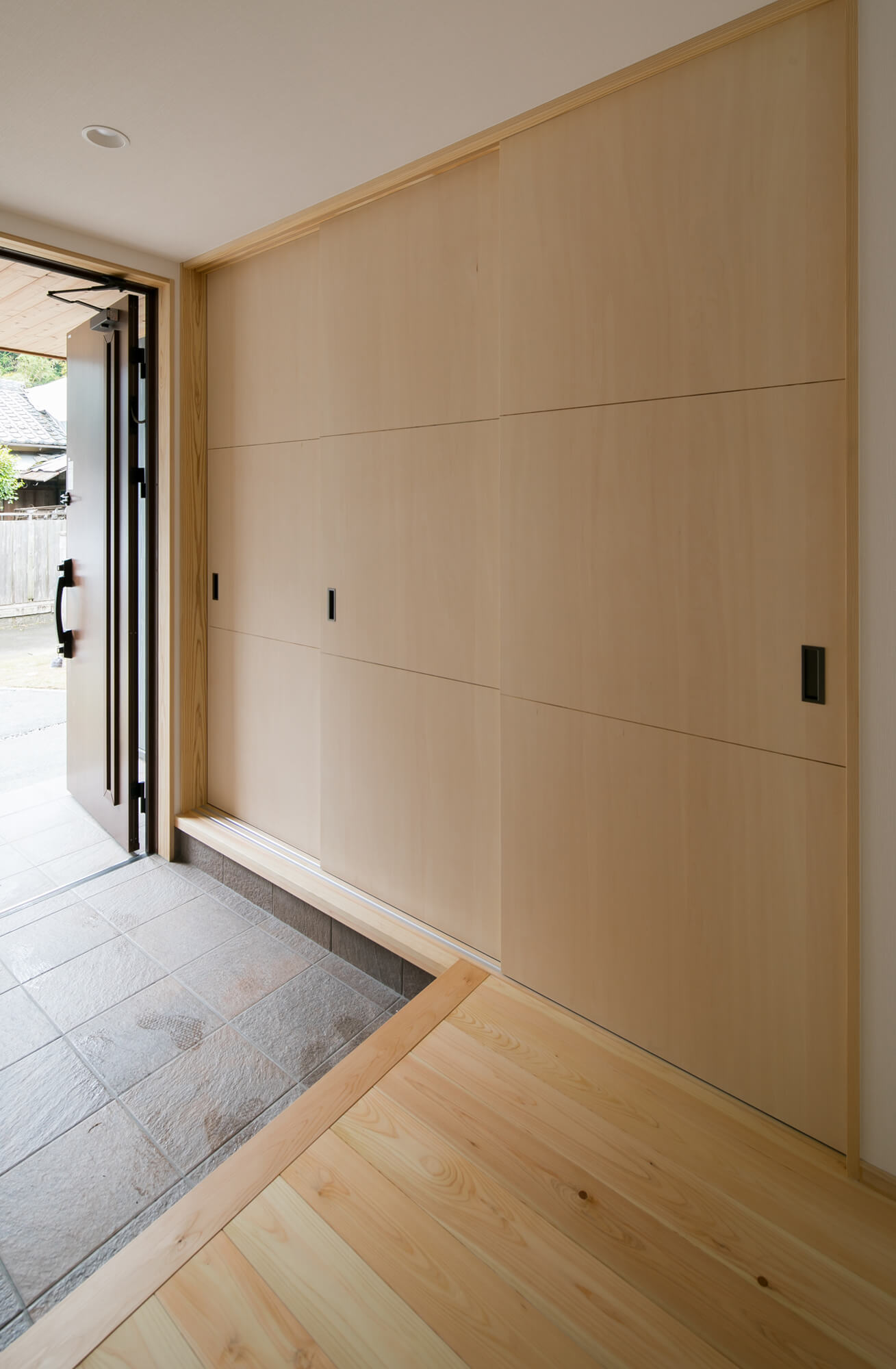 その街並みを壊すことのない外観はグリーンがかったグレーの杉羽目板と、ベージュのそとん壁で落ち着いた佇まいで作られています。決して大きな家ではありませんが、家族5人が互いの気配を感じられるような、暮らしやすい間取りになりました。全面に作られたウッドデッキはリビングに広がりを感じさせ、キッチン収納を全て目隠しするようにしたことで、雑然とした印象にはなりません。