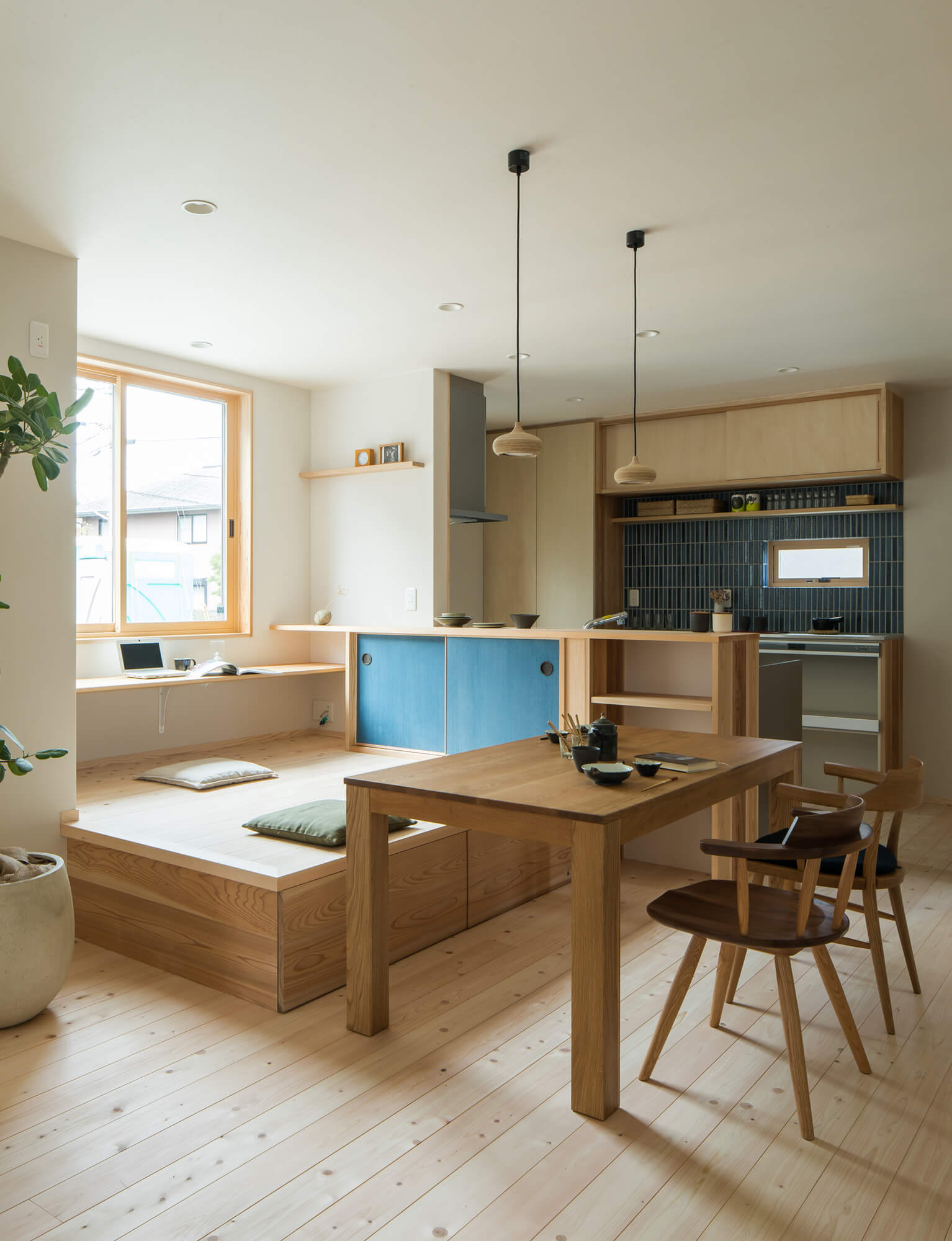 ダイニングの一角に借景を楽しむ小上がりとカウンターを造りました。緑が楽しめる居心地の良い居場所です。