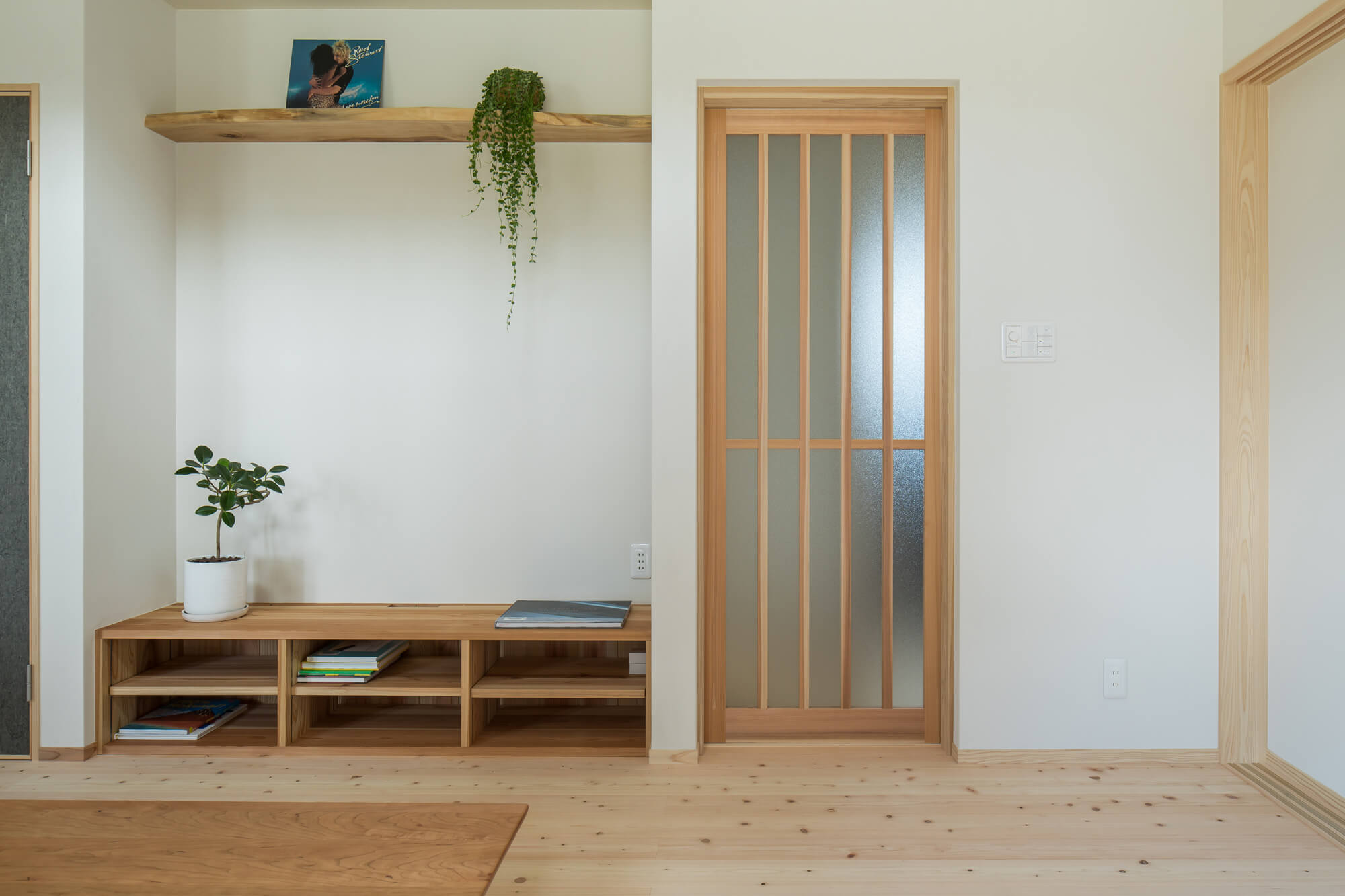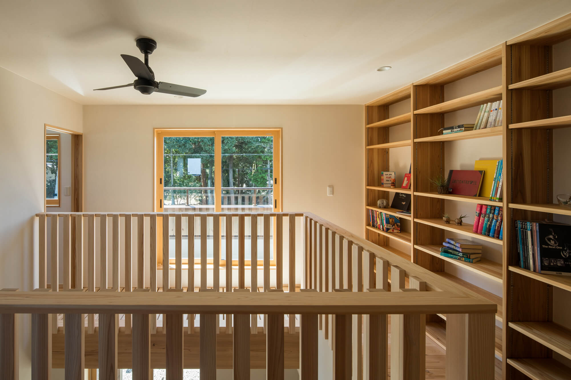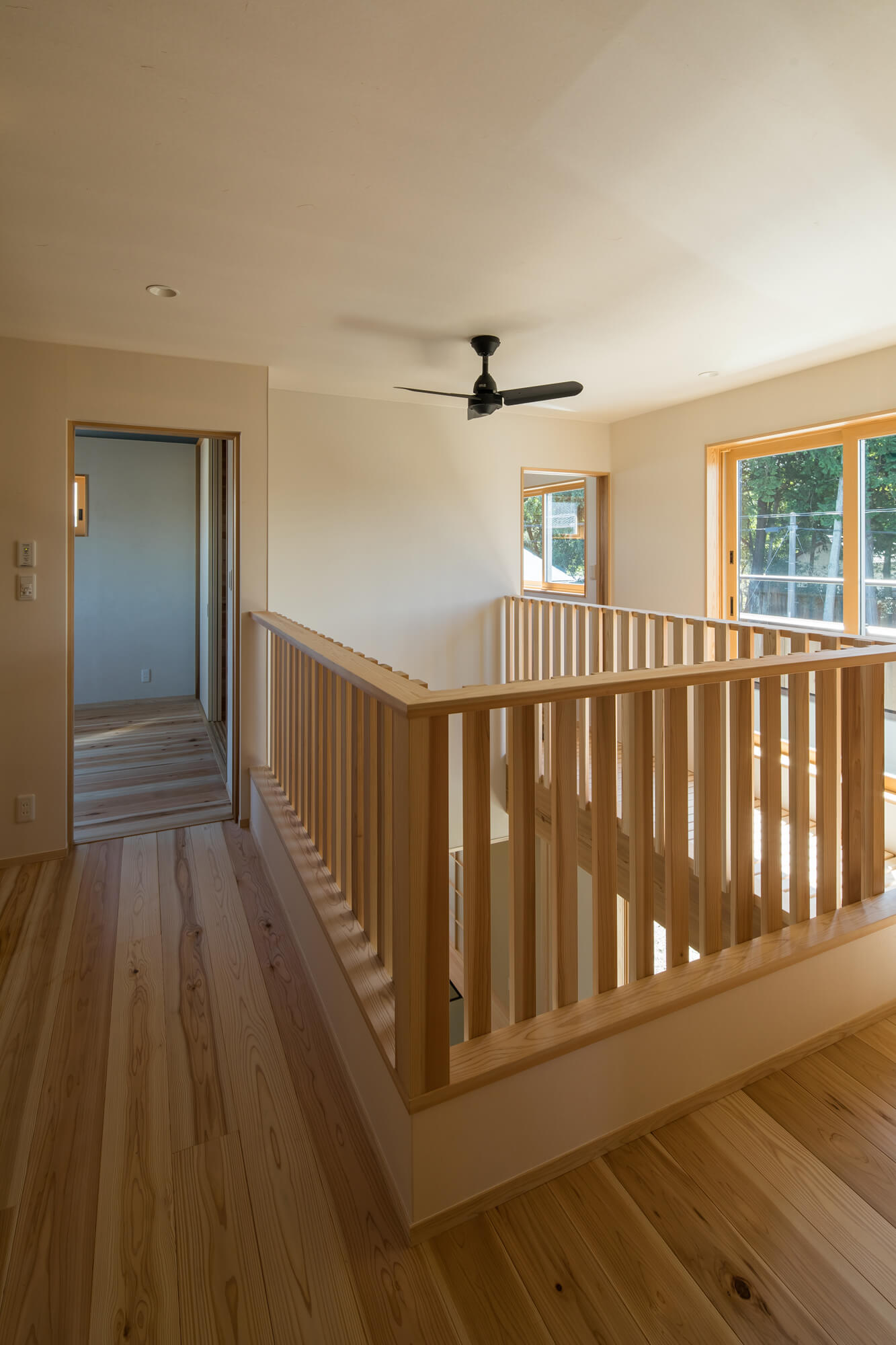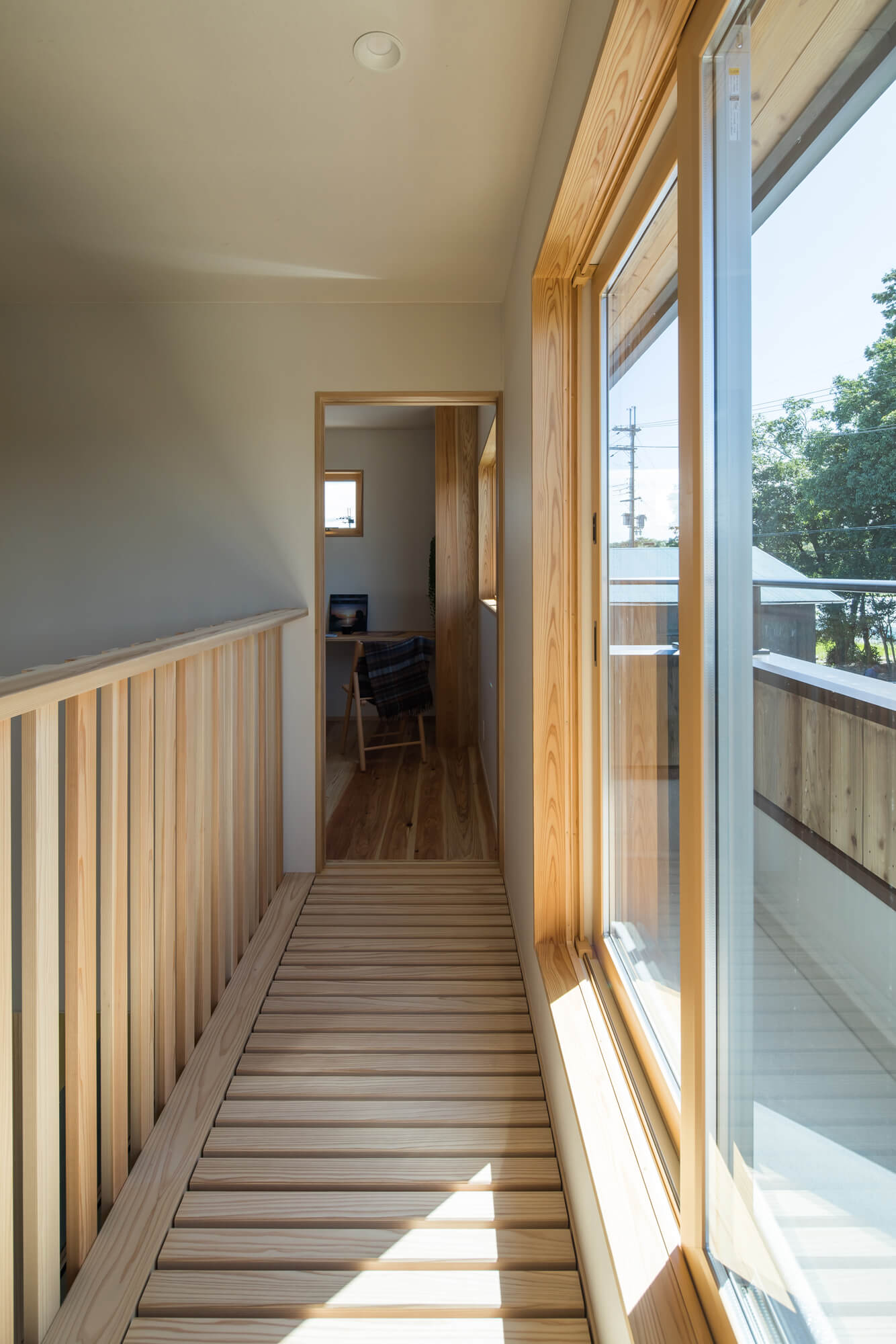 ヒノキ床の小上がりには借景を楽しむ窓