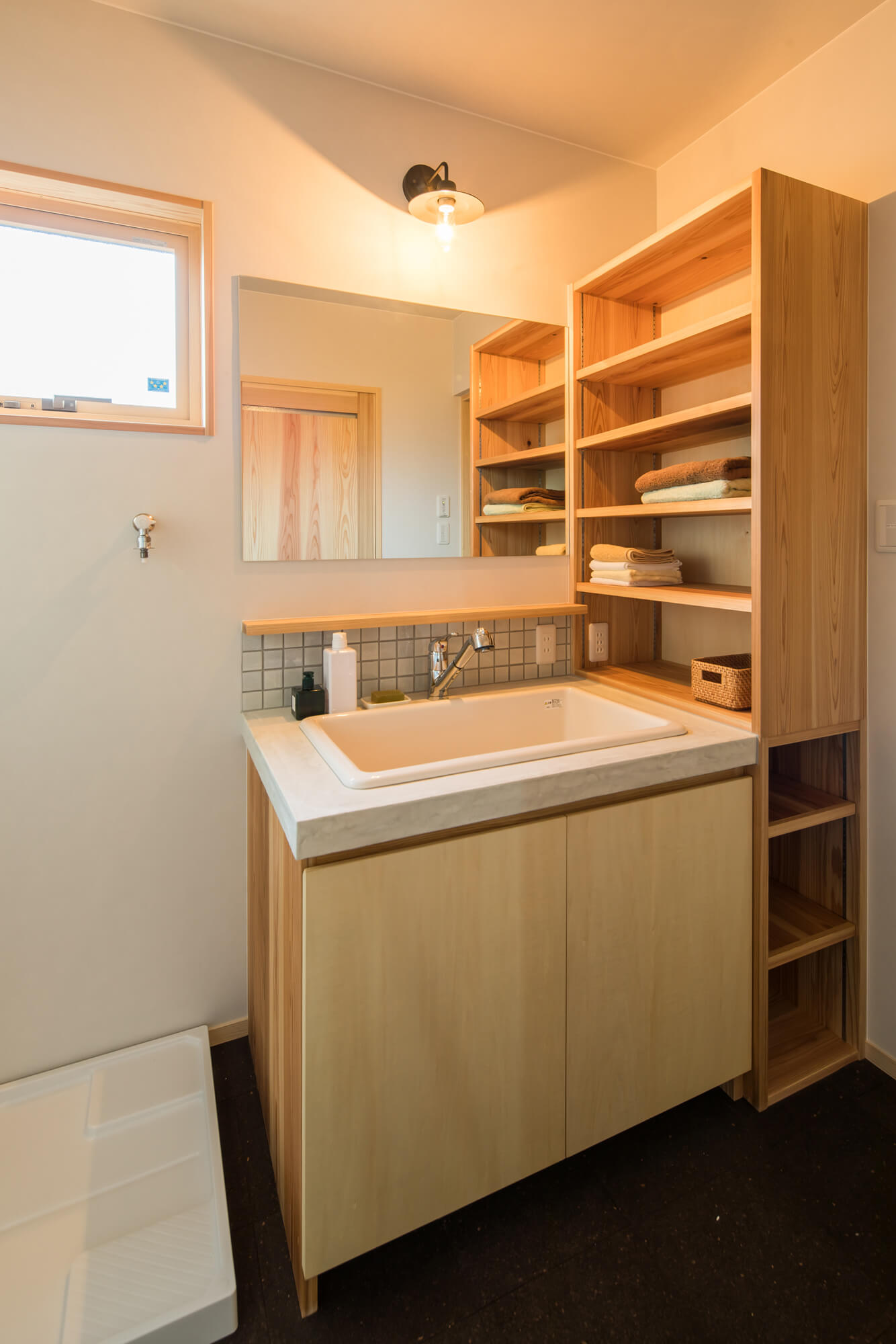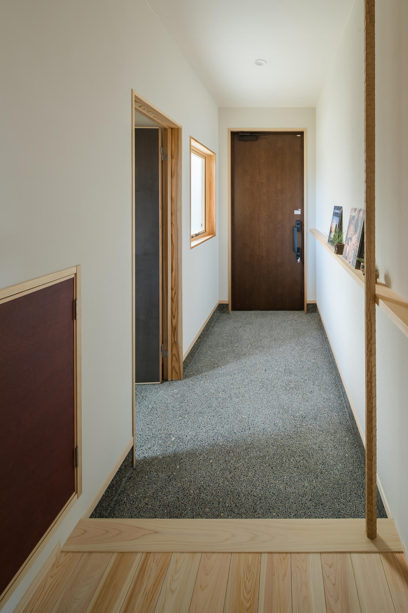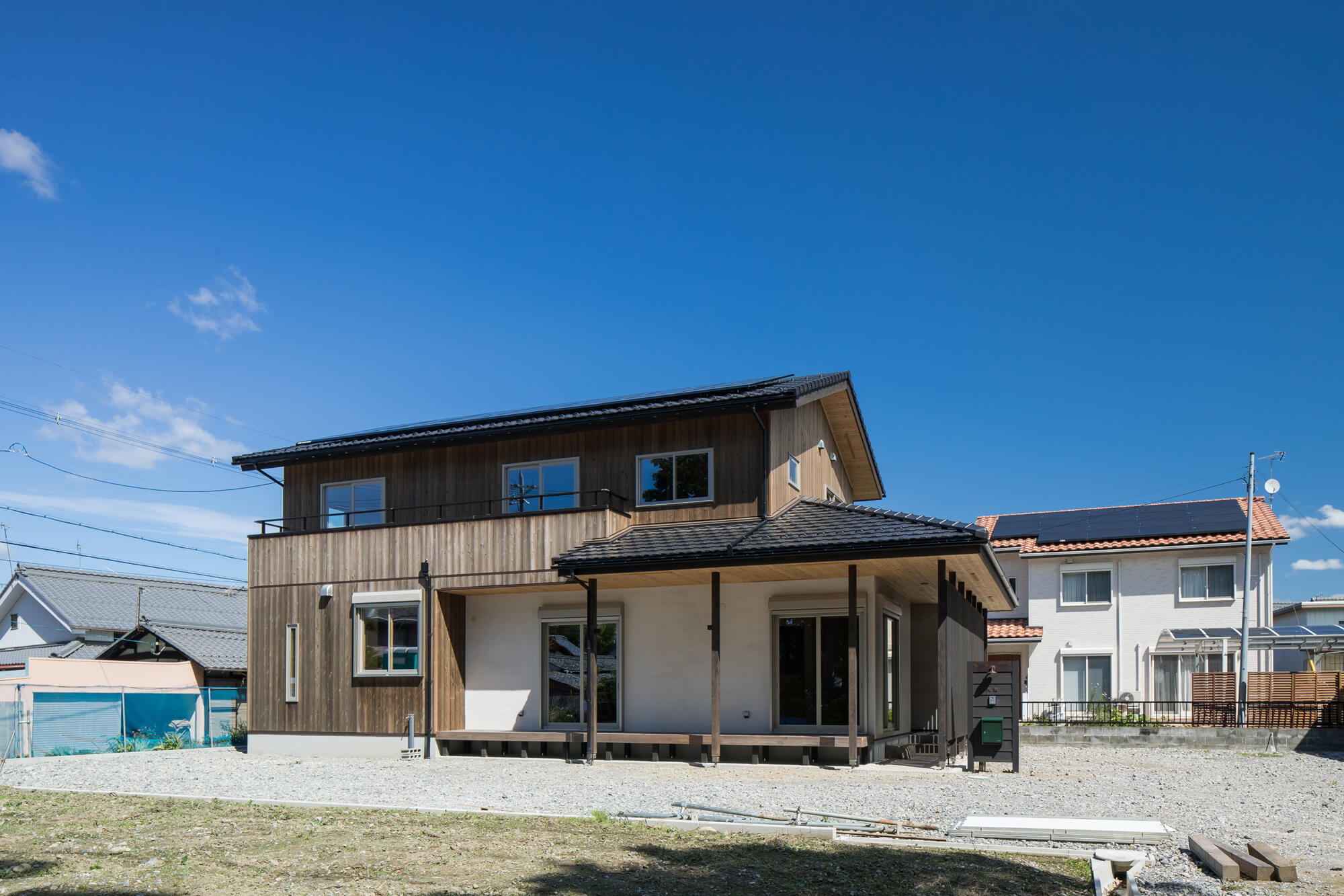 外壁にはウッドロングエコの杉板と火山灰のそとん壁を使用し、ほぼメンテナンスフリーになっています。室内もヒノキ・杉の床に珪藻土の塗り壁と長く住みつないでいける上質な家を目指した若い子育て世代の家です。建具も和紙貼りや杉の製作でオリジナルな仕上がりで、小上がりのスタディスペースや大容量の2階の本棚、板壁の書斎など家族の趣味も十分に反映された作りです。また、床下エアコンを採用し、高断熱の玄関ドア(YKKのイノベスト)や樹脂サッシの仕様で家中1台のエアコンで暖房してもエネルギーコストのかからない作りです。