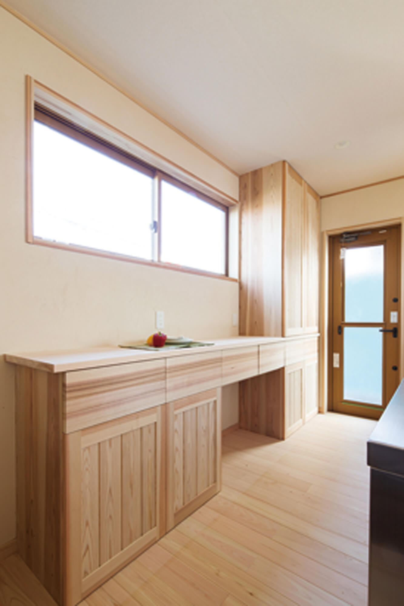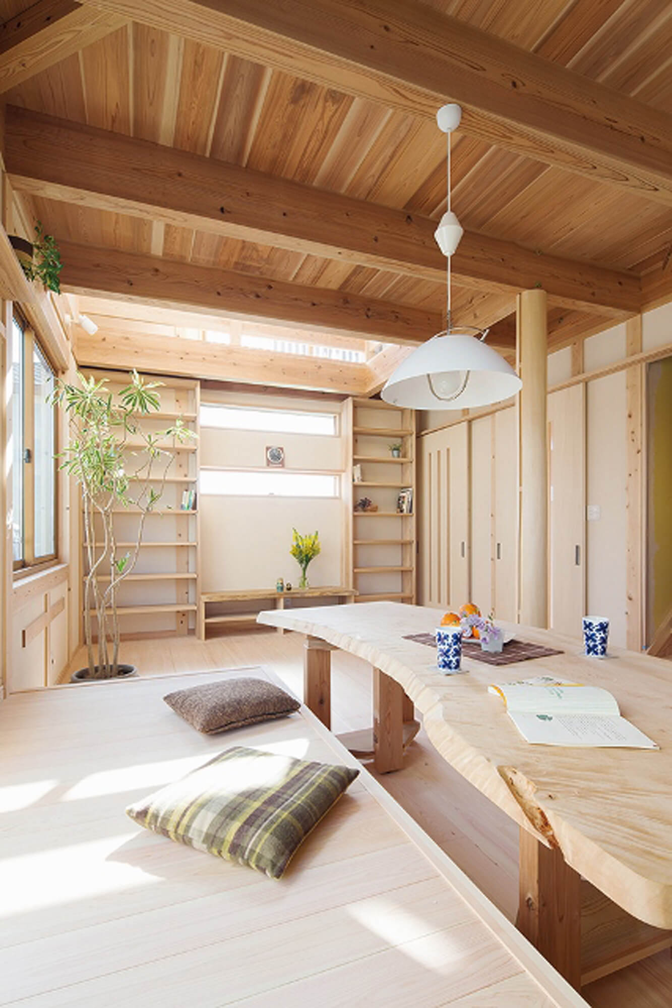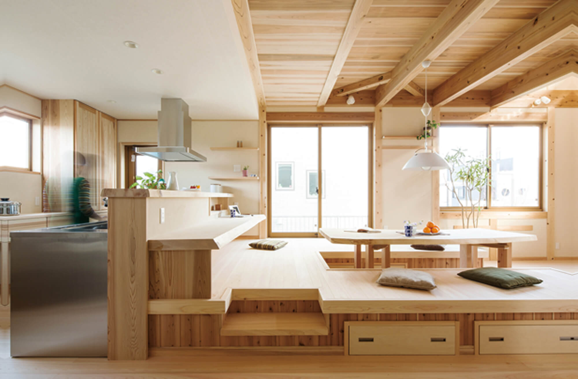 リビングはご自分で買い付けられた節のない桧、天井や2階床は杉、WCには抗菌作用のある漆塗りの松を採用され、カップボードも杉で製作し、キッチンもオールステンレスの無垢材でフルオーダーされました。ダイニングは収納を兼ねた小上がりの床にして、ここで家族が食事をしたり、宿題したり、仕事したりと、集う中心になります。