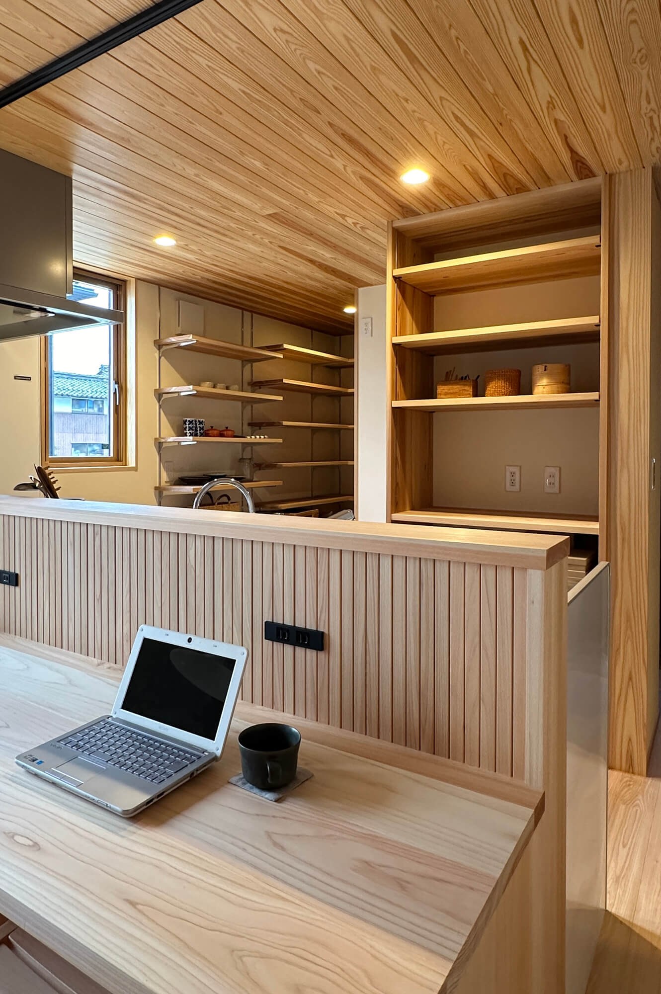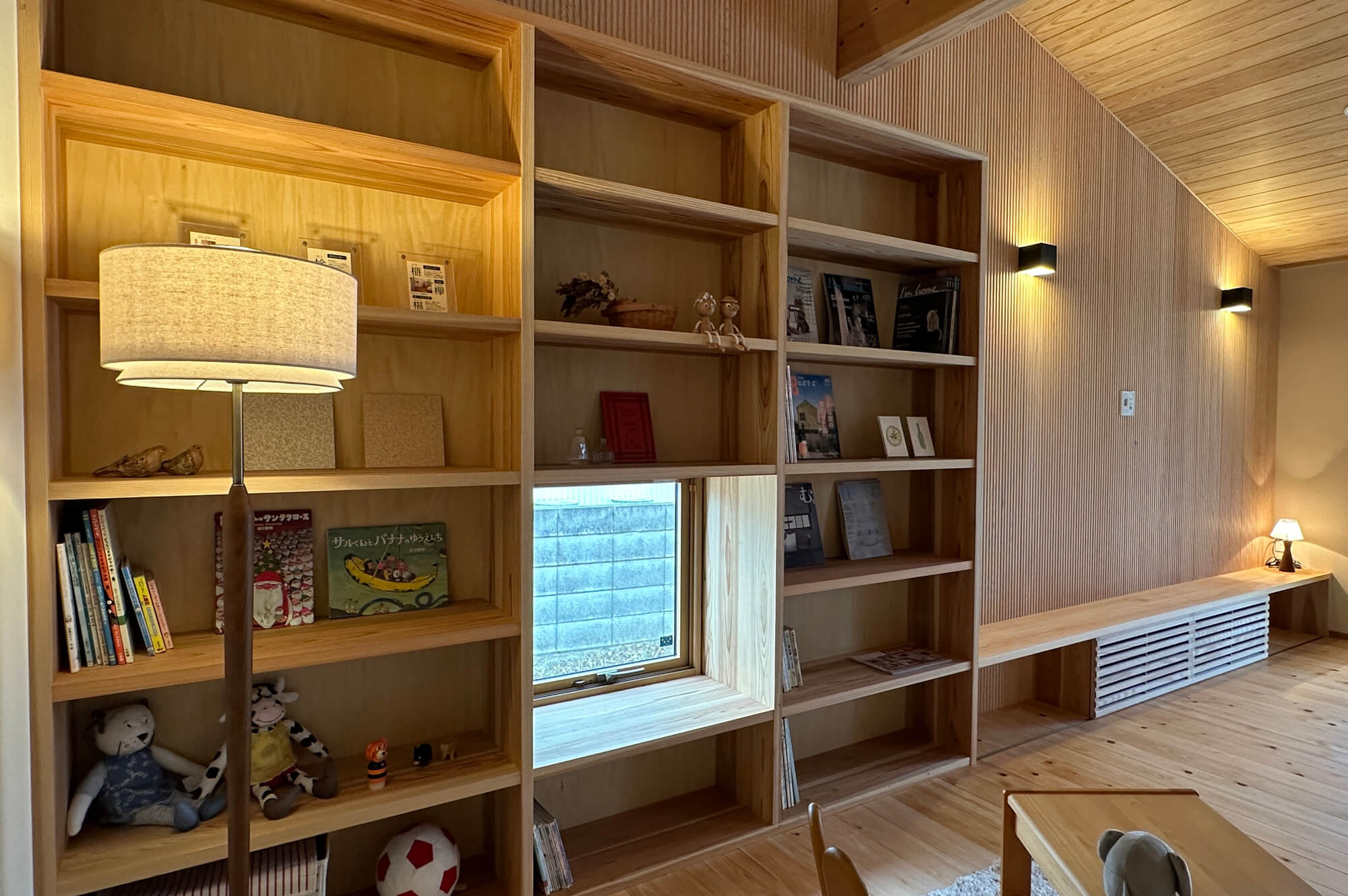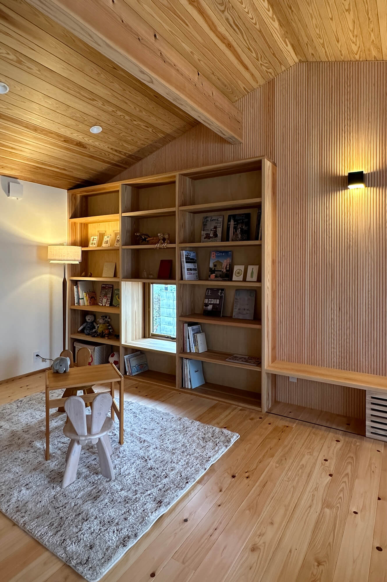 外装や内装に木や塗り壁などの素材を使うのはもちろんのこと、リビングのアクセントには桧をストライプ状に加工したこなみ板と呼ばれるものを採用しました。壁に陰影が出て良いアクセントになっています。大きな本棚は家族の居場所として、子供が小さいうちはラグなどを敷いてキッズコーナー、大きくなればお気に入りの椅子を置いてファミリーライブラリーとして活用していきます。