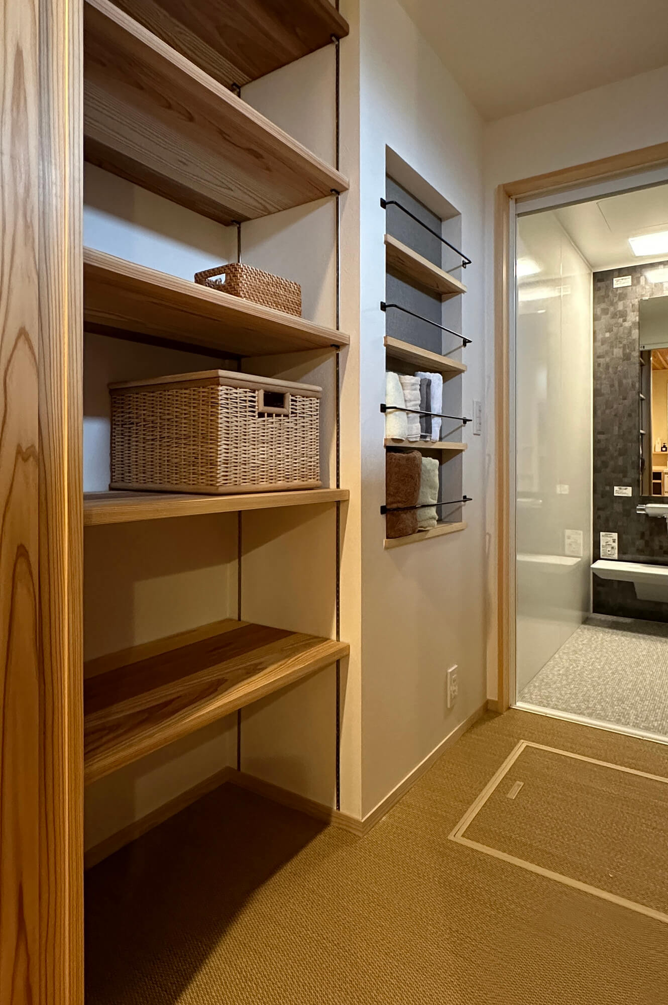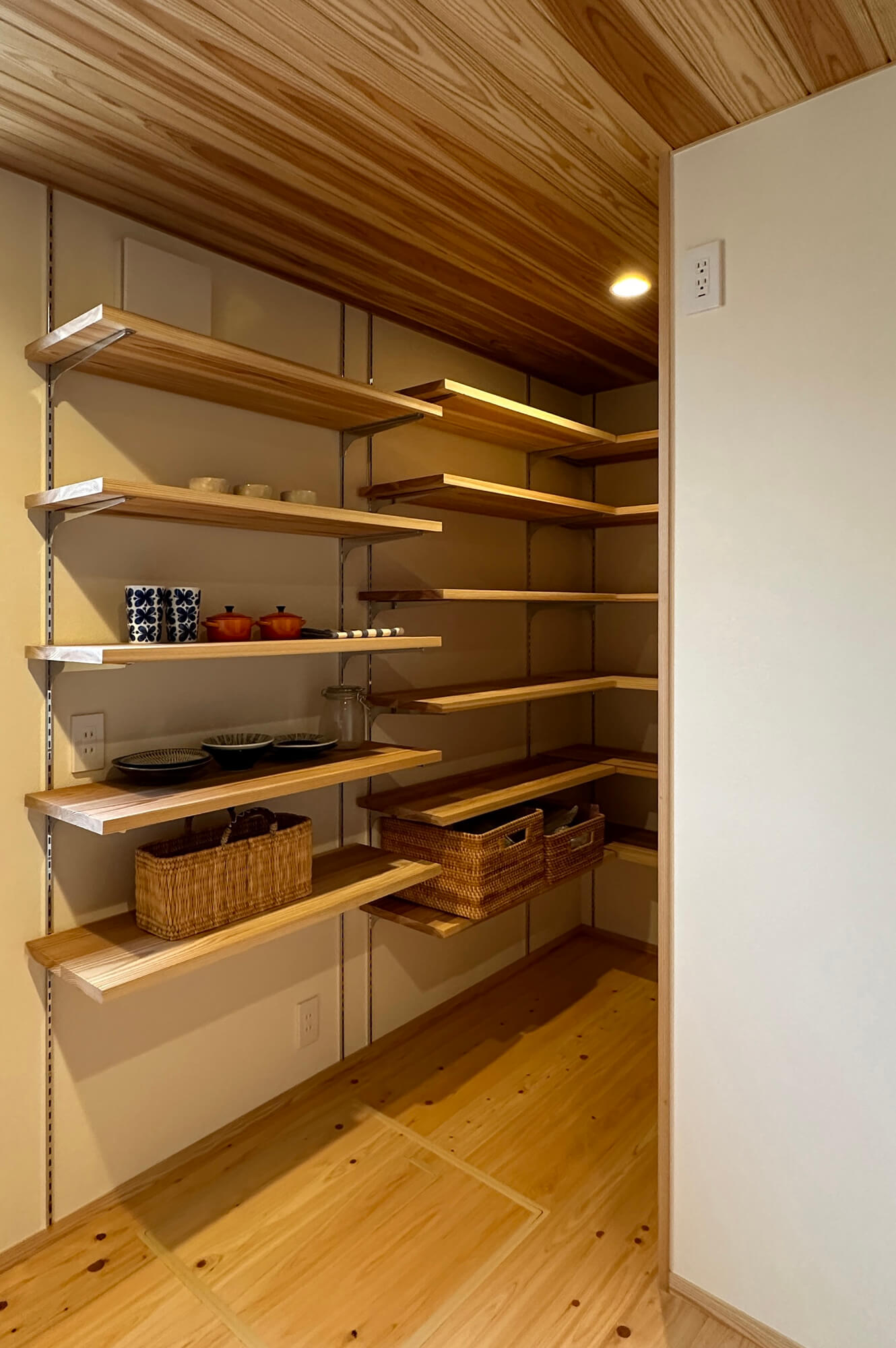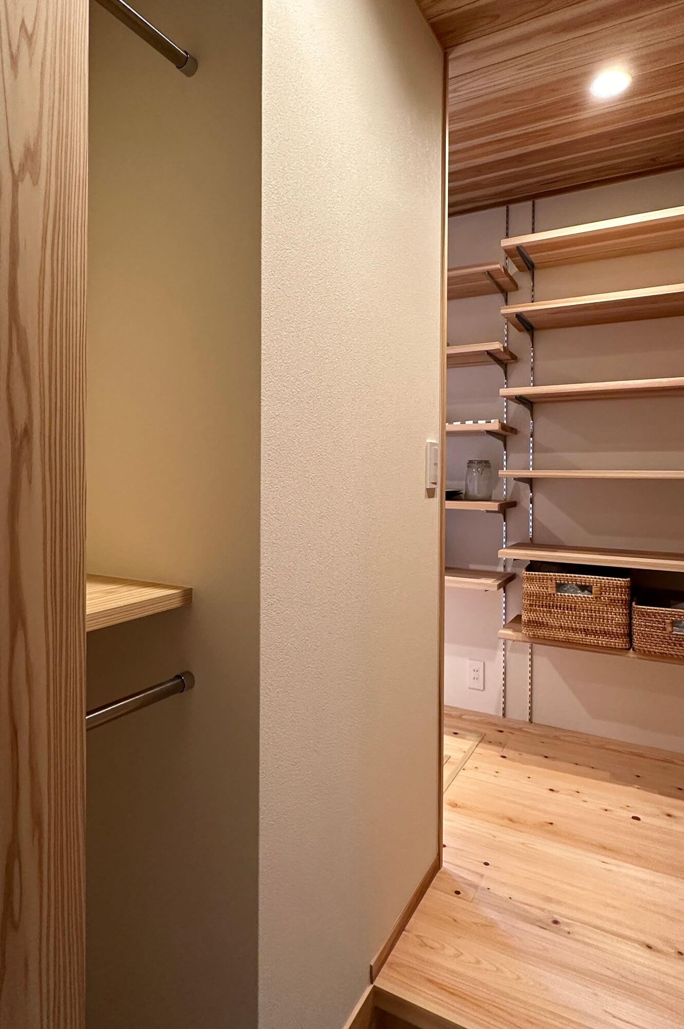 外装や内装に木や塗り壁などの素材を使うのはもちろんのこと、リビングのアクセントには桧をストライプ状に加工したこなみ板と呼ばれるものを採用しました。壁に陰影が出て良いアクセントになっています。大きな本棚は家族の居場所として、子供が小さいうちはラグなどを敷いてキッズコーナー、大きくなればお気に入りの椅子を置いてファミリーライブラリーとして活用していきます。