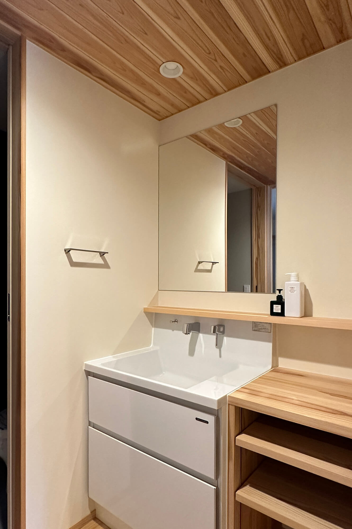 実用面でも玄関から直接キッチンに入れる裏動線を作ったり、機能性を重視しつつ自分らしさを盛り込んだ洗面台などこだわりも実現させました。