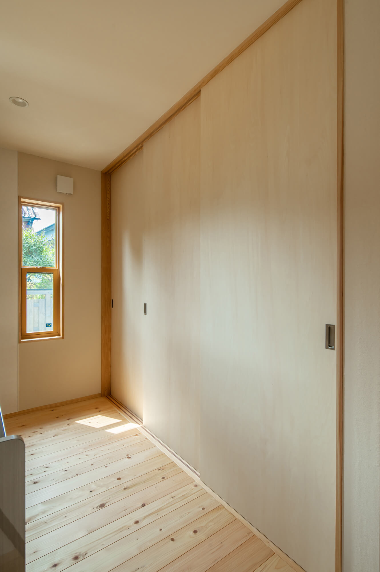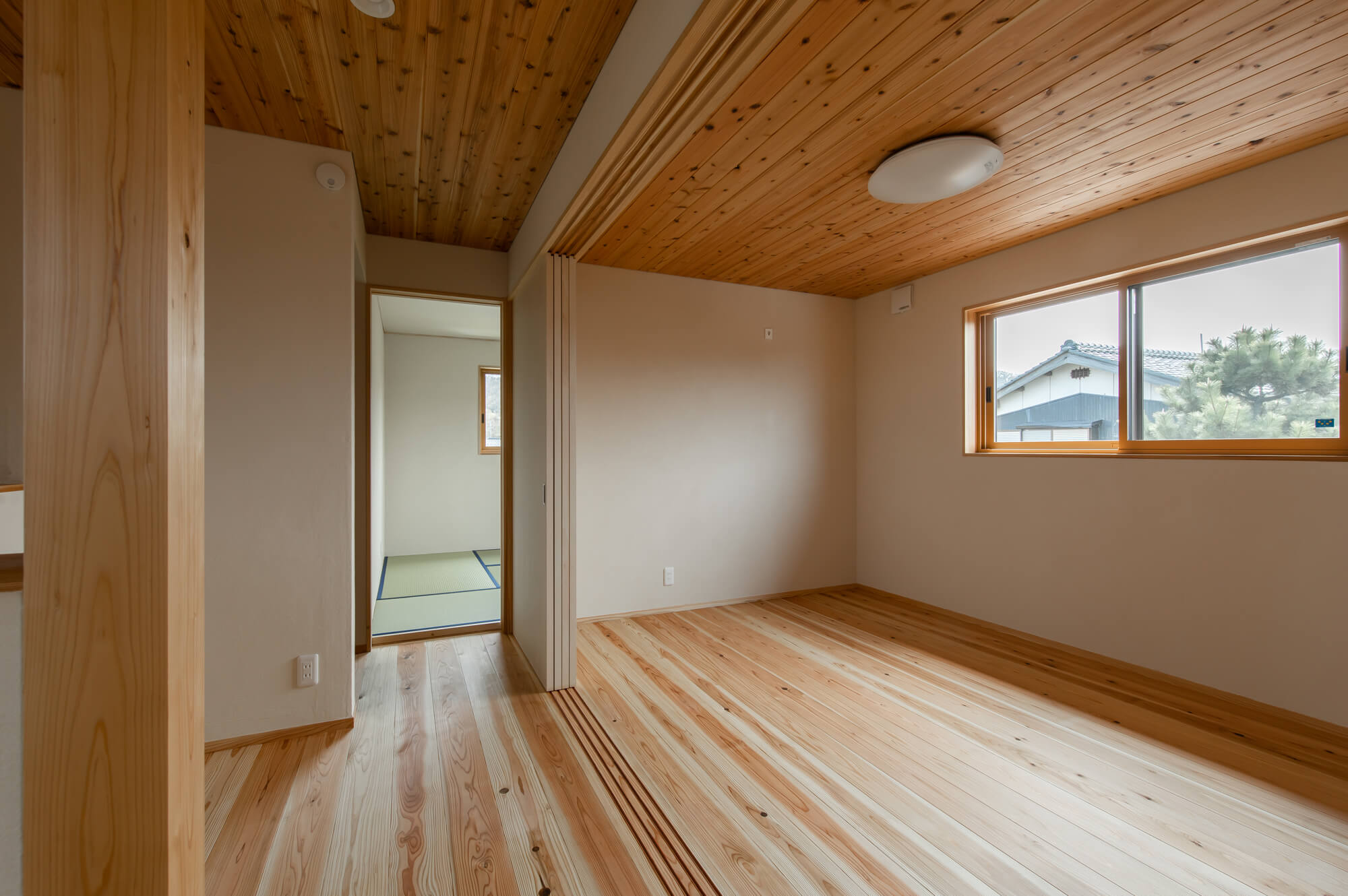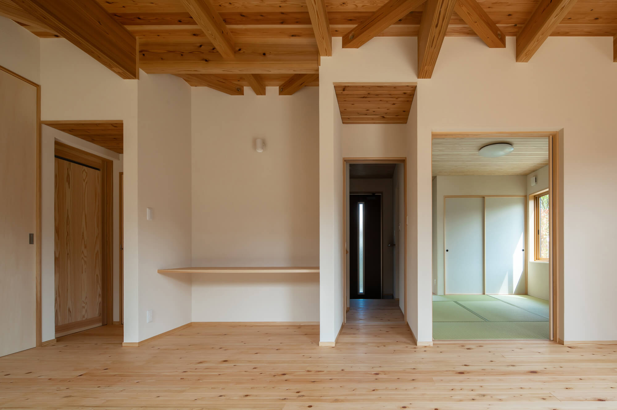 1階の天井が2階の床となる「ササラ天井」を採用され、将来吹き抜けを作れるような仕上げ、仕切れる子供室や2階ホールなど、家族と共に変化する家となりました。内部も塗り壁と無垢の木で作られ、心地よい空間になりました。