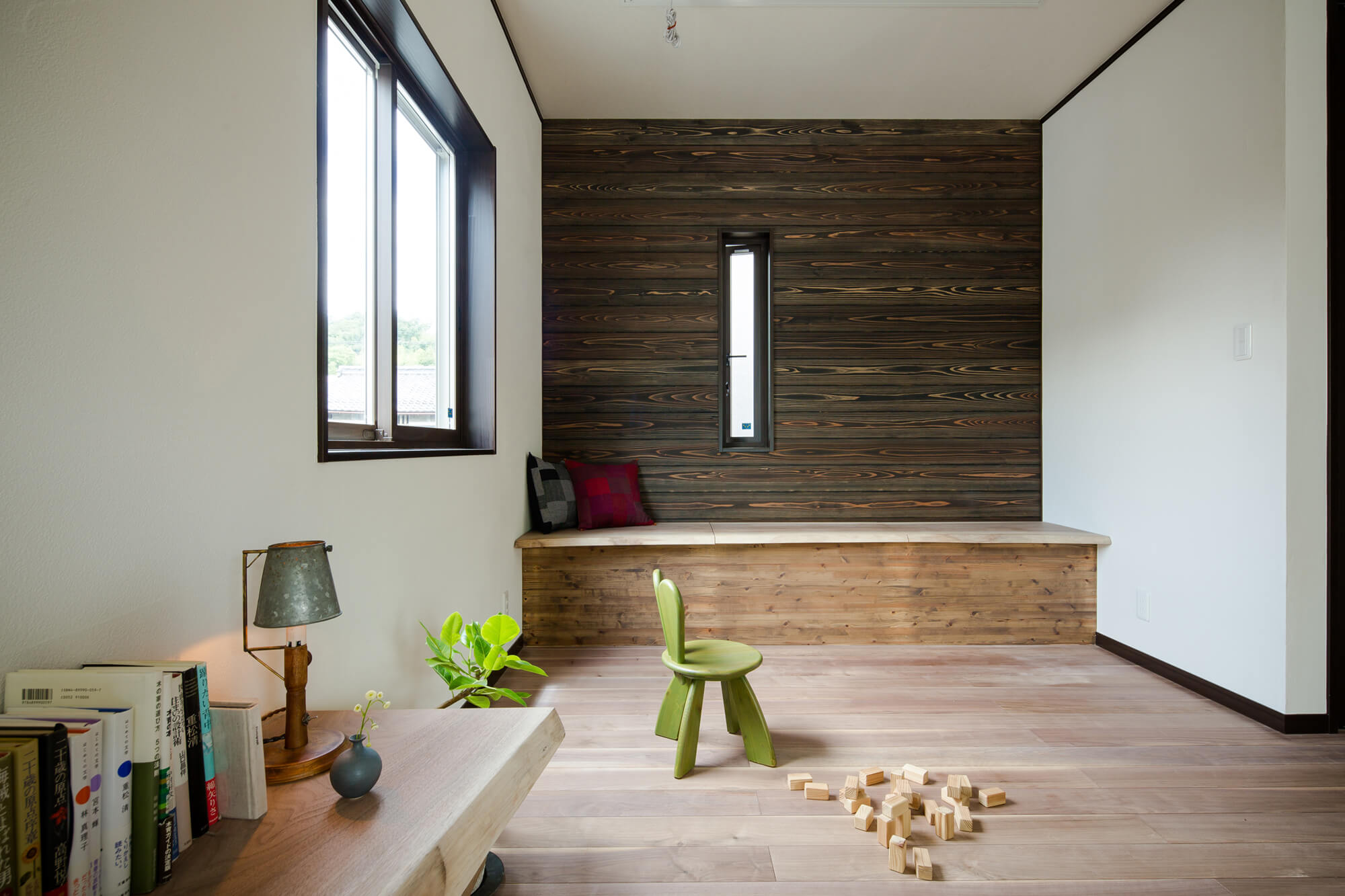 リビングにベンチ収納を造った焼杉の家