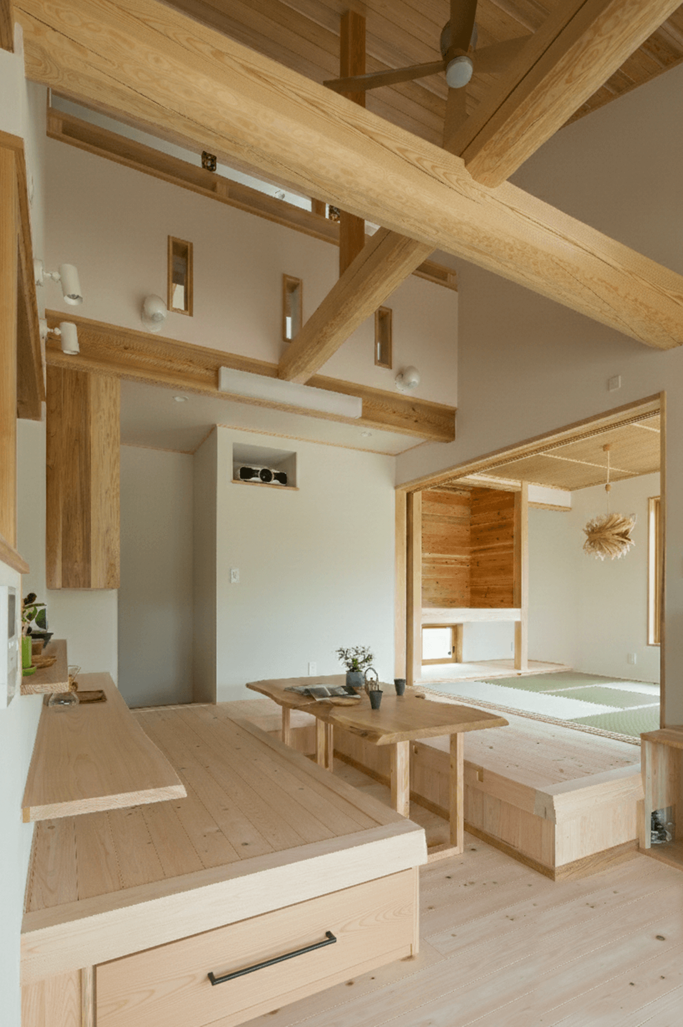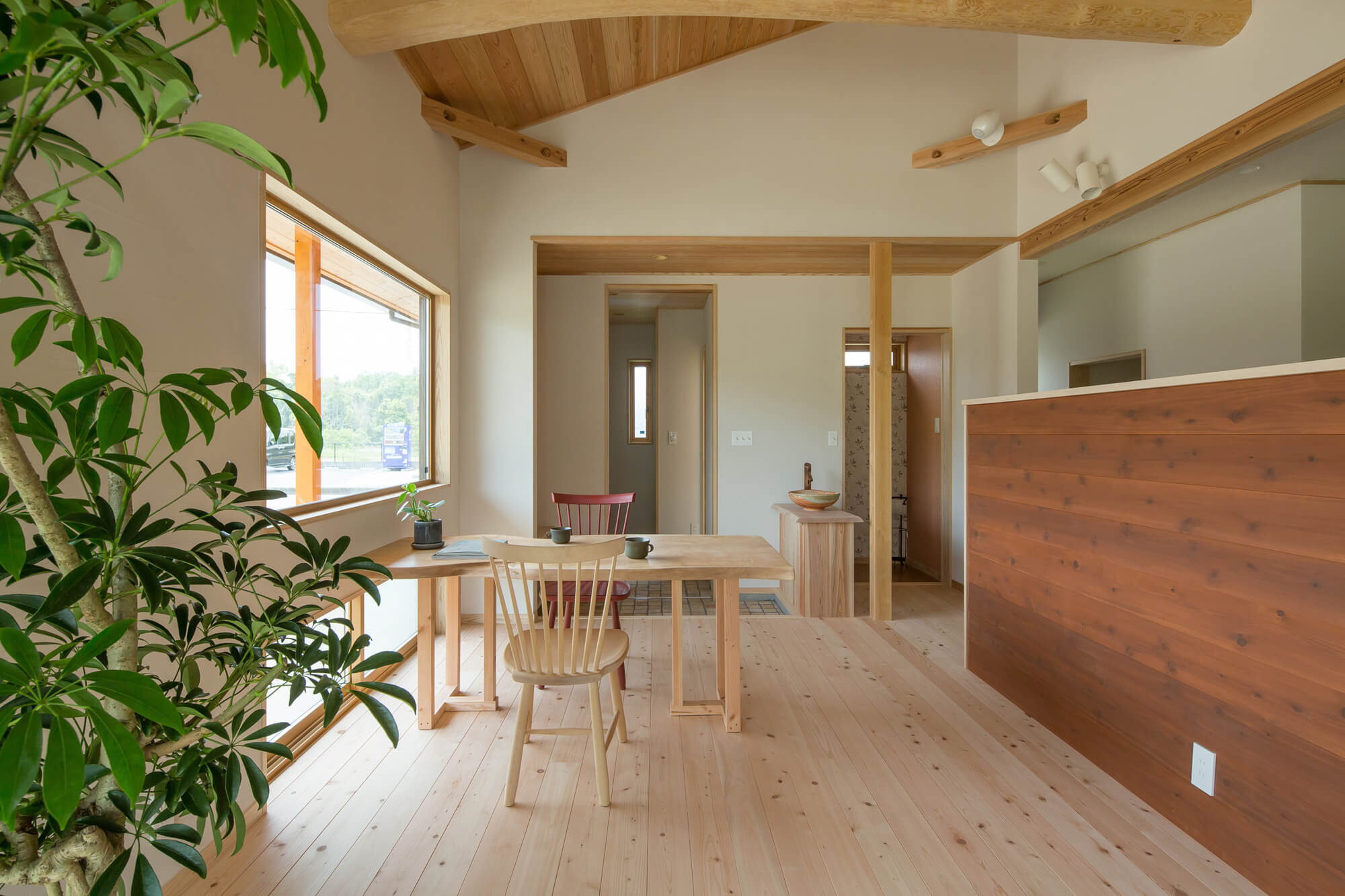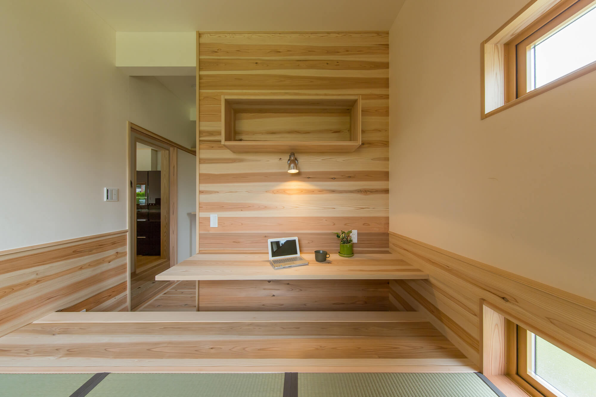 「こんな暮らしがしたかった。」自分たちの理想がここに。大屋根が印象的な一見平屋に見える外観。デッキから広がる風景、庭が一望できる将来のカフェスペース、ヒノキや杉の香りと温かさ、小上がりのダイニング、奥様の書斎を兼ねた寝室、本を読んだり勉強したりする2階ホールのカウンター、こだわりの素材選び等など、すべてにお客様の思いが詰まった家になりました。憧れだったイメージを実現しつつ、無垢の木や土といった自然素材の心地よさと、長期優良住宅の性能を持っています。