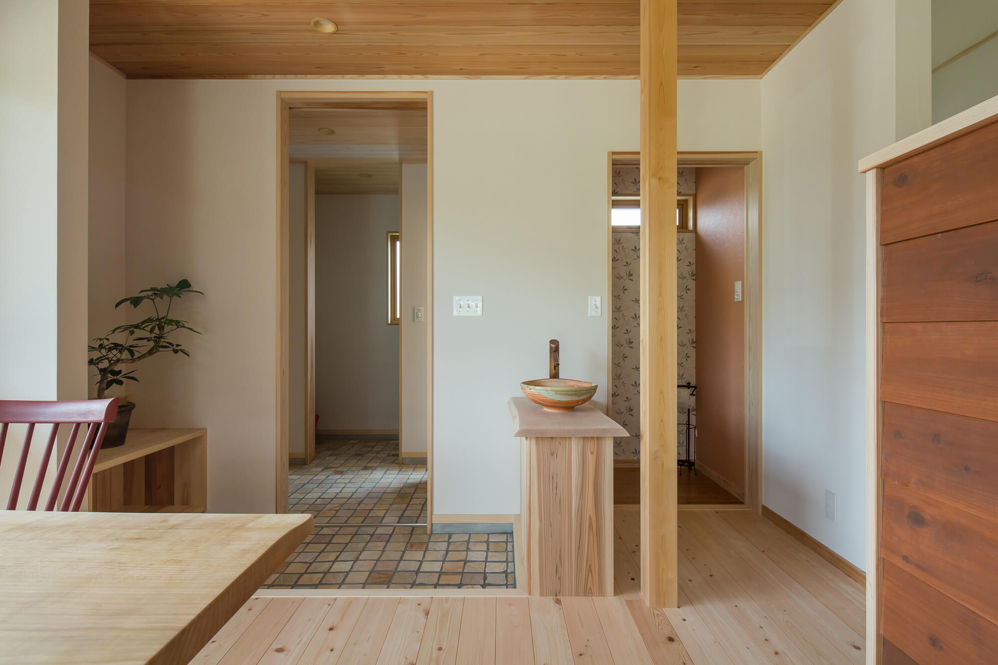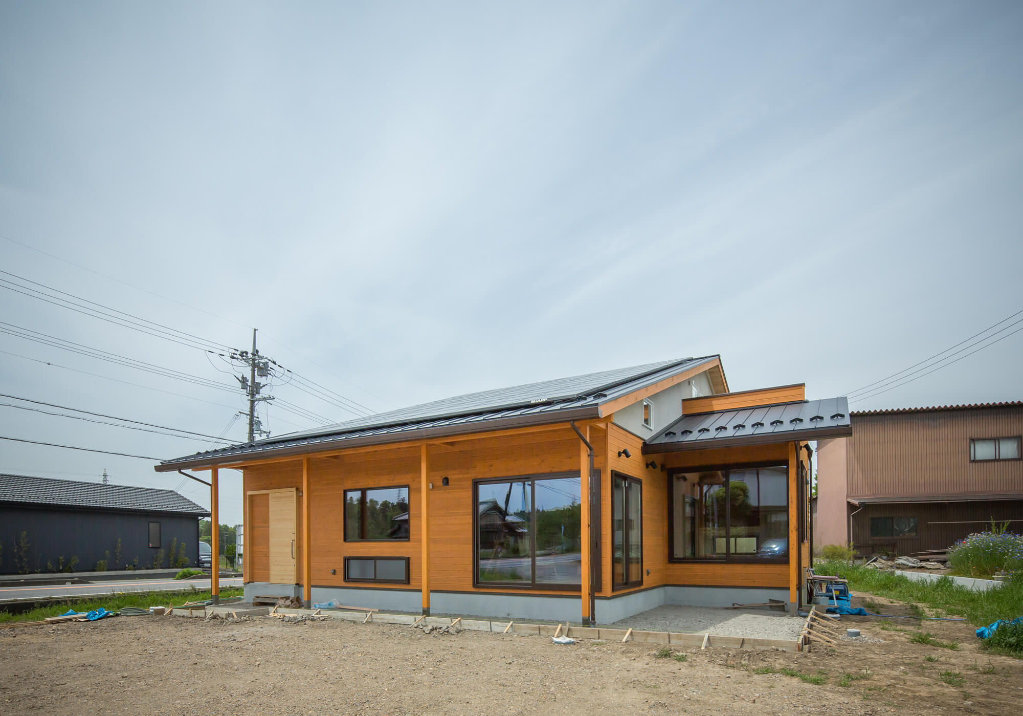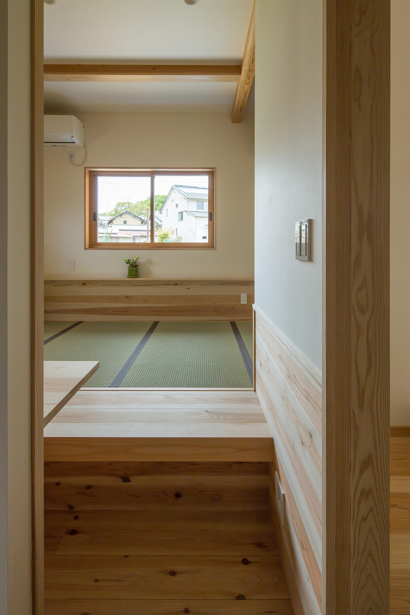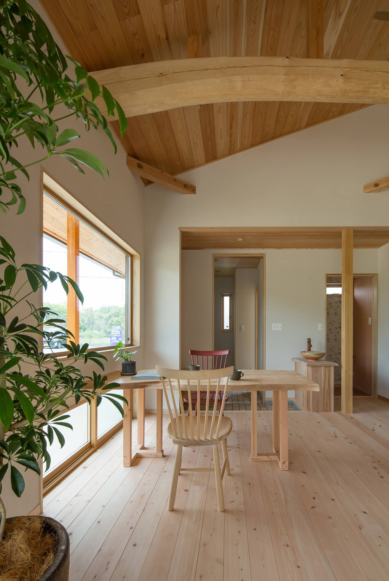 「こんな暮らしがしたかった。」自分たちの理想がここに。大屋根が印象的な一見平屋に見える外観。デッキから広がる風景、庭が一望できる将来のカフェスペース、ヒノキや杉の香りと温かさ、小上がりのダイニング、奥様の書斎を兼ねた寝室、本を読んだり勉強したりする2階ホールのカウンター、こだわりの素材選び等など、すべてにお客様の思いが詰まった家になりました。憧れだったイメージを実現しつつ、無垢の木や土といった自然素材の心地よさと、長期優良住宅の性能を持っています。