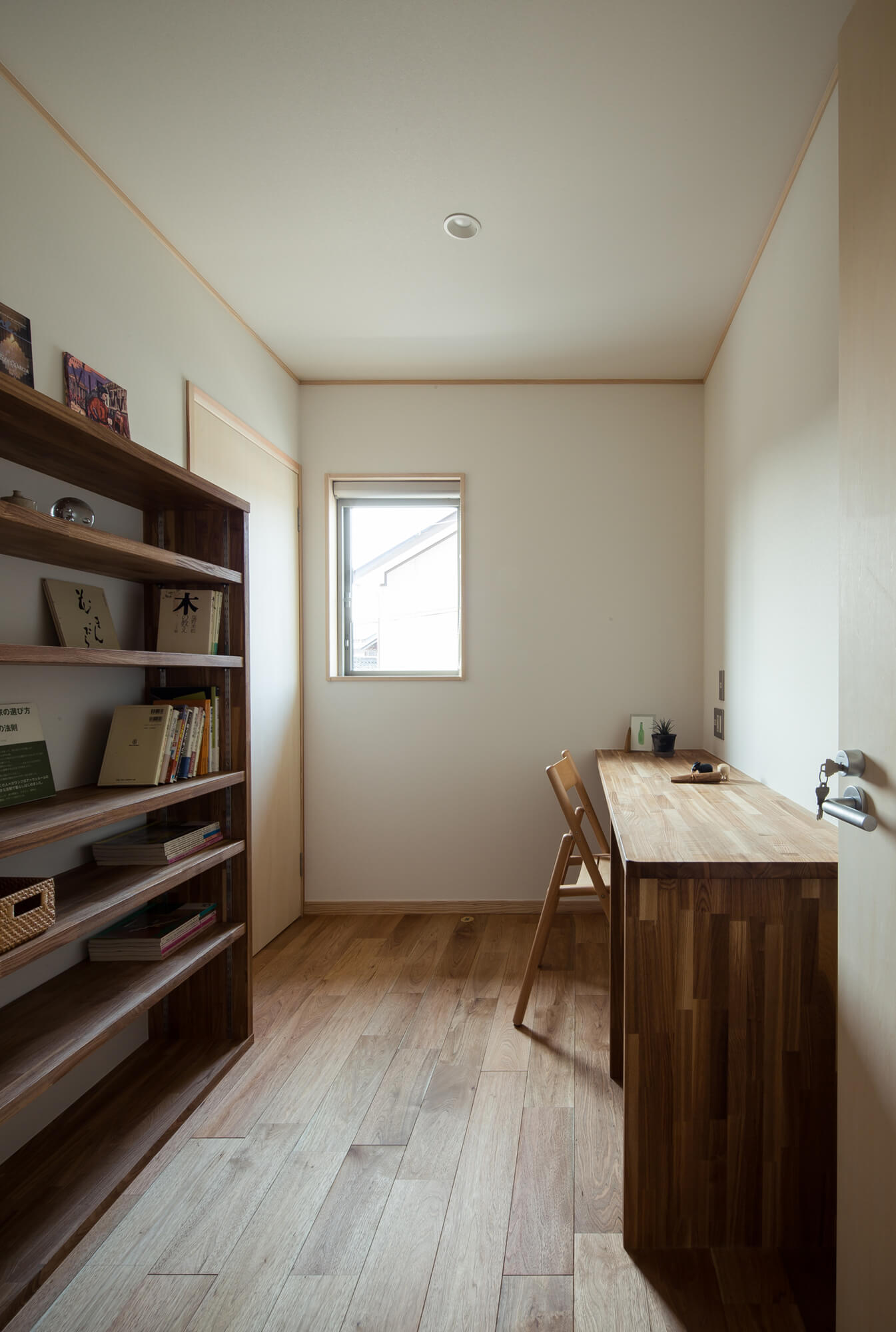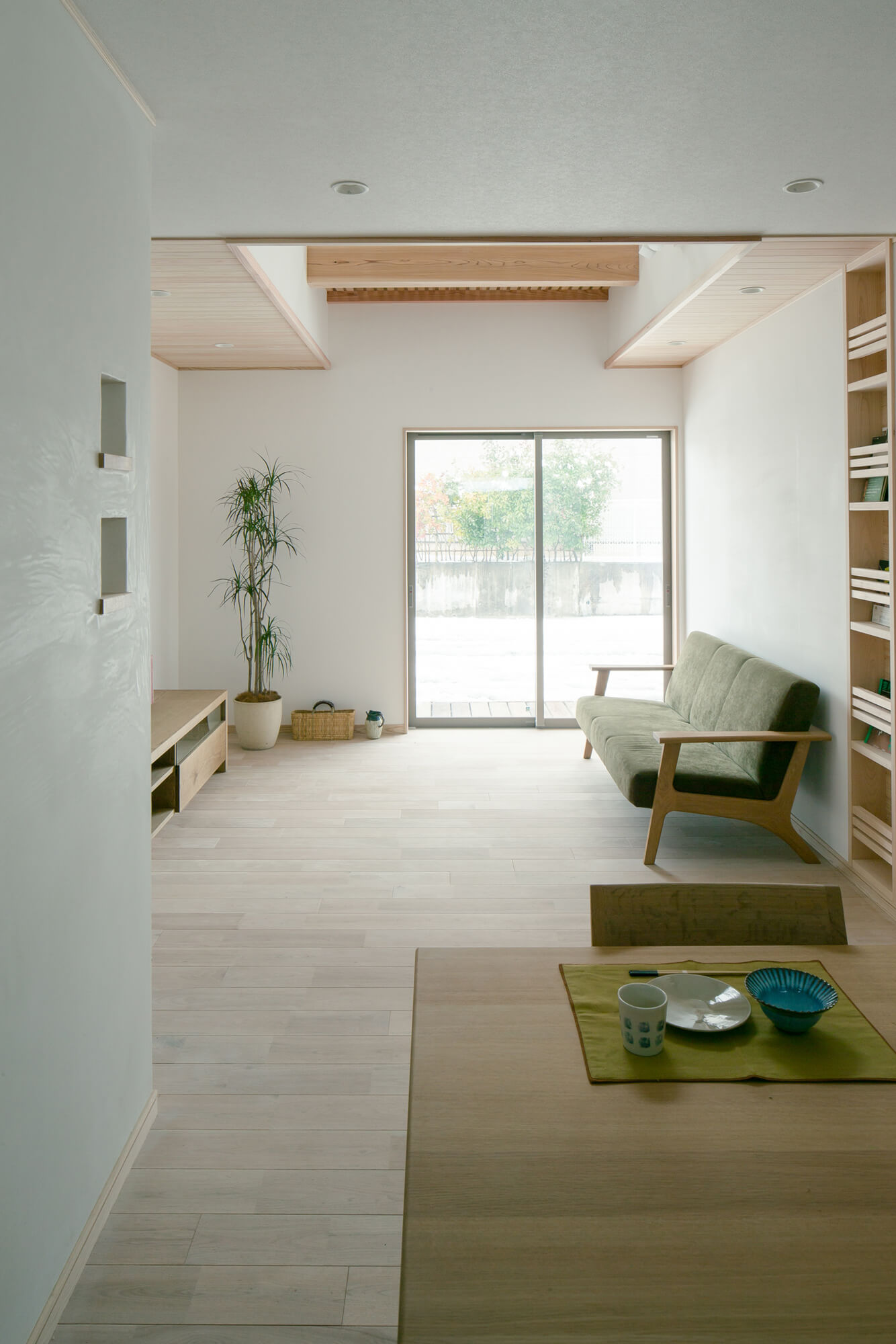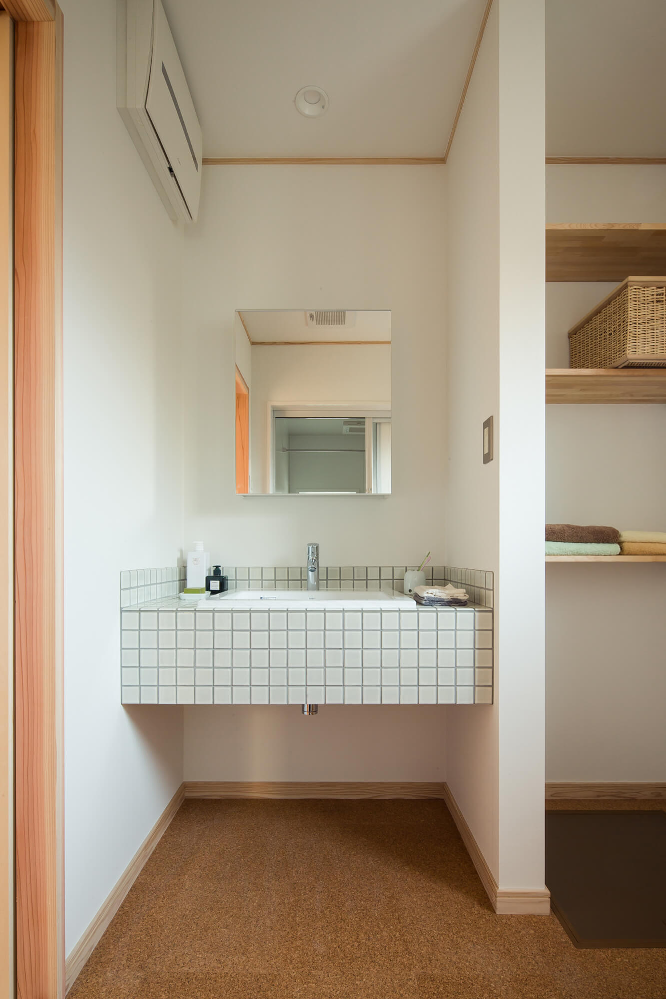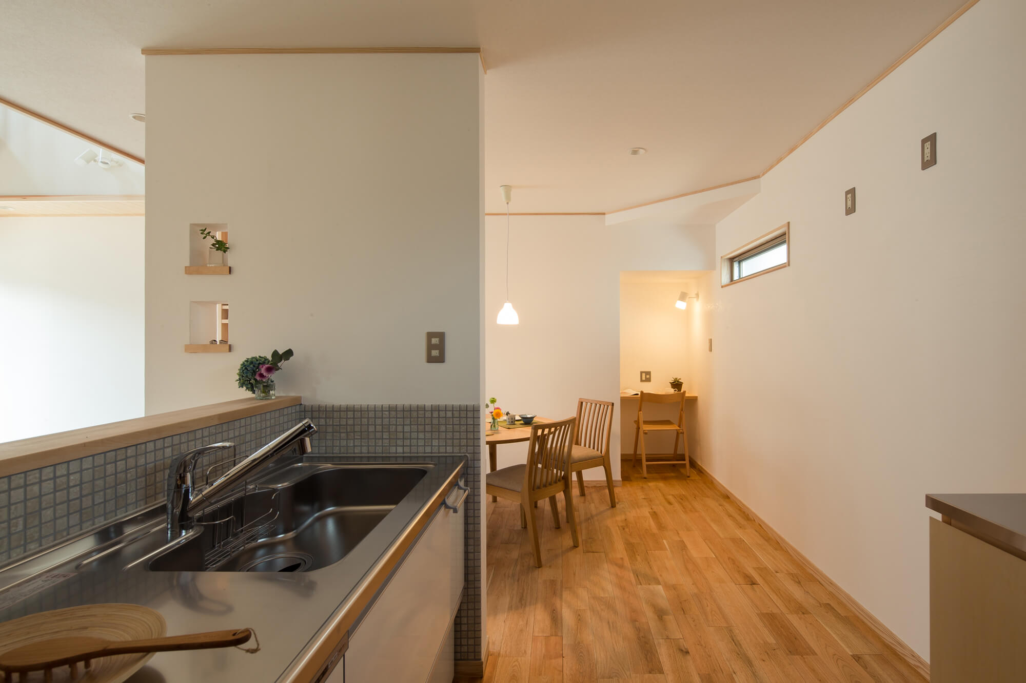 外観から内装に至るまで明確なイメージをお持ちのお施主様でした。そうしたイメージをひとつひとつ打ち合わせの中で確かめながら形にしてゆき、そうして出来上がったのは、深い白色の静謐な印象の家でした。床はクルミ材を使い、壁は漆喰で仕上げました。随所に奥様のお好きな和テイストのシンプルなタイルを使い、建具もシナ材で製作することにより、シンプルで大人っぽい仕上がりになりました。