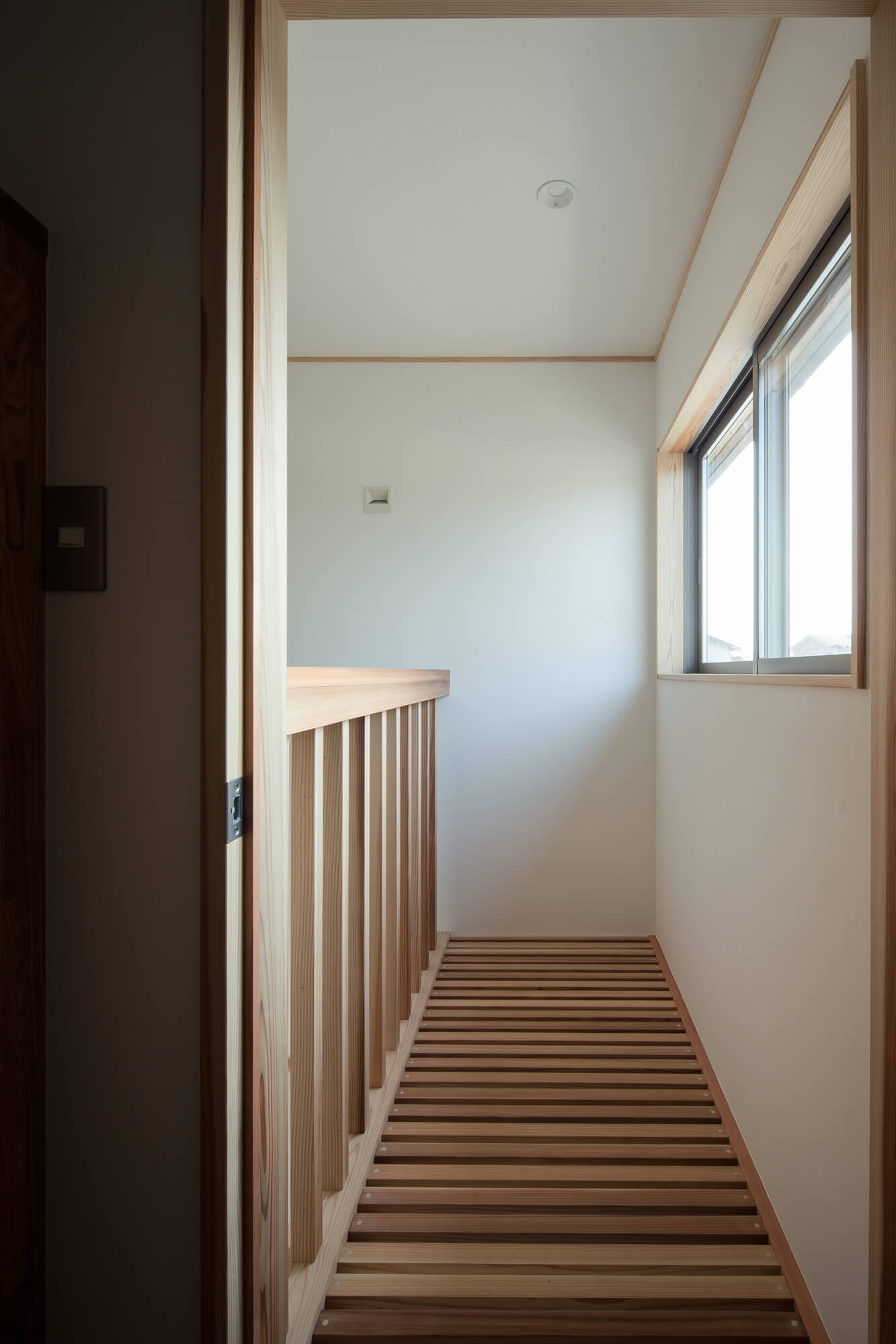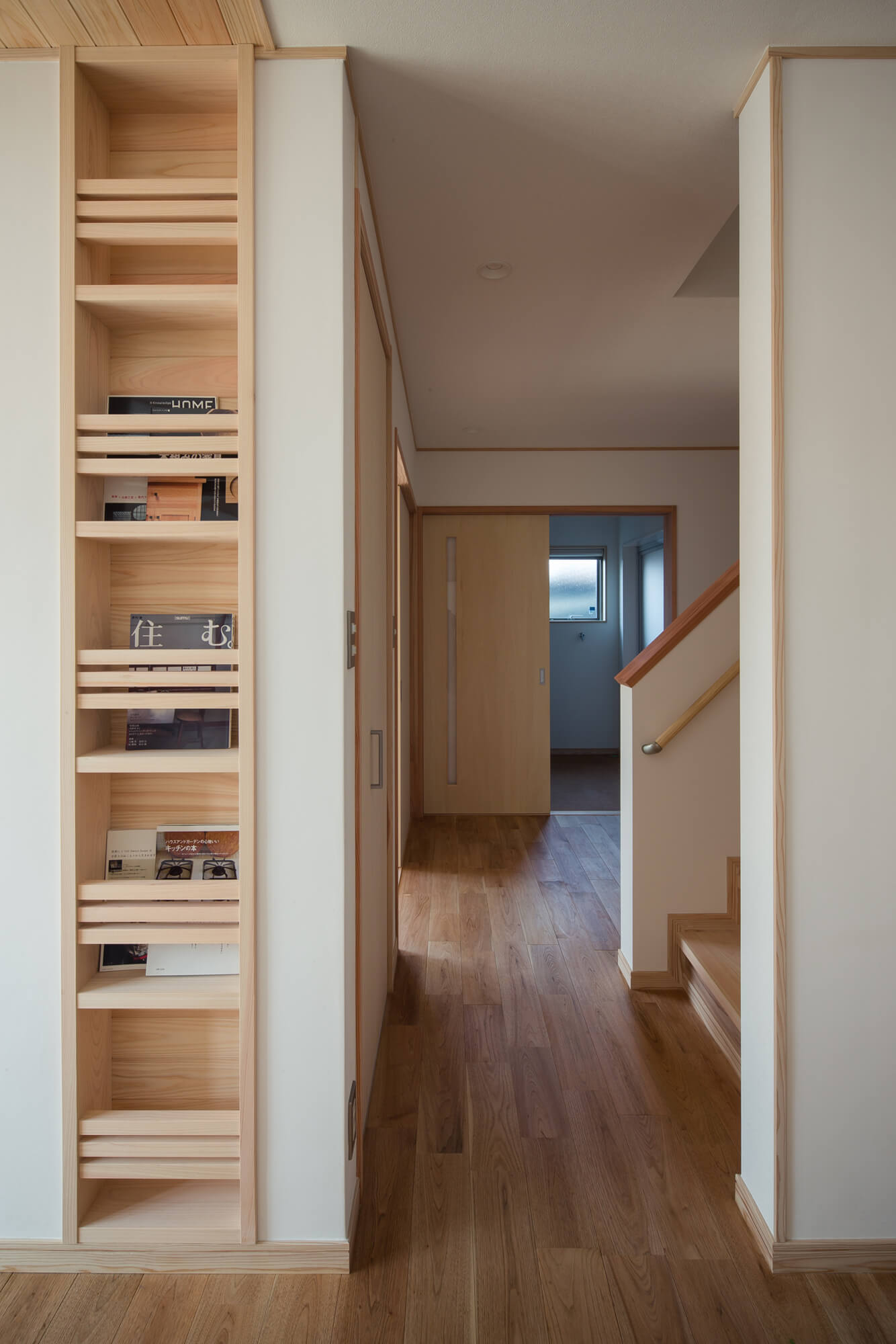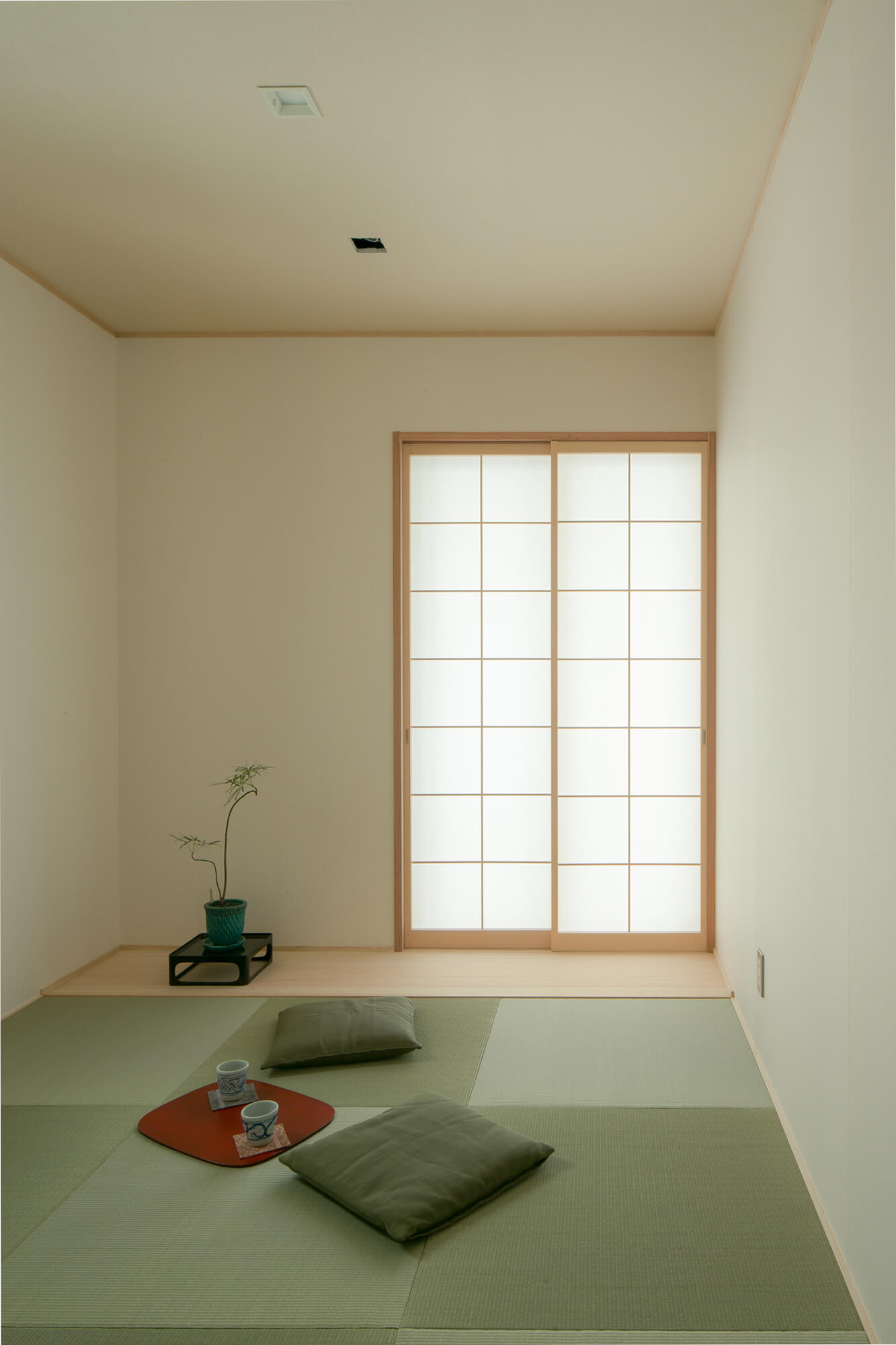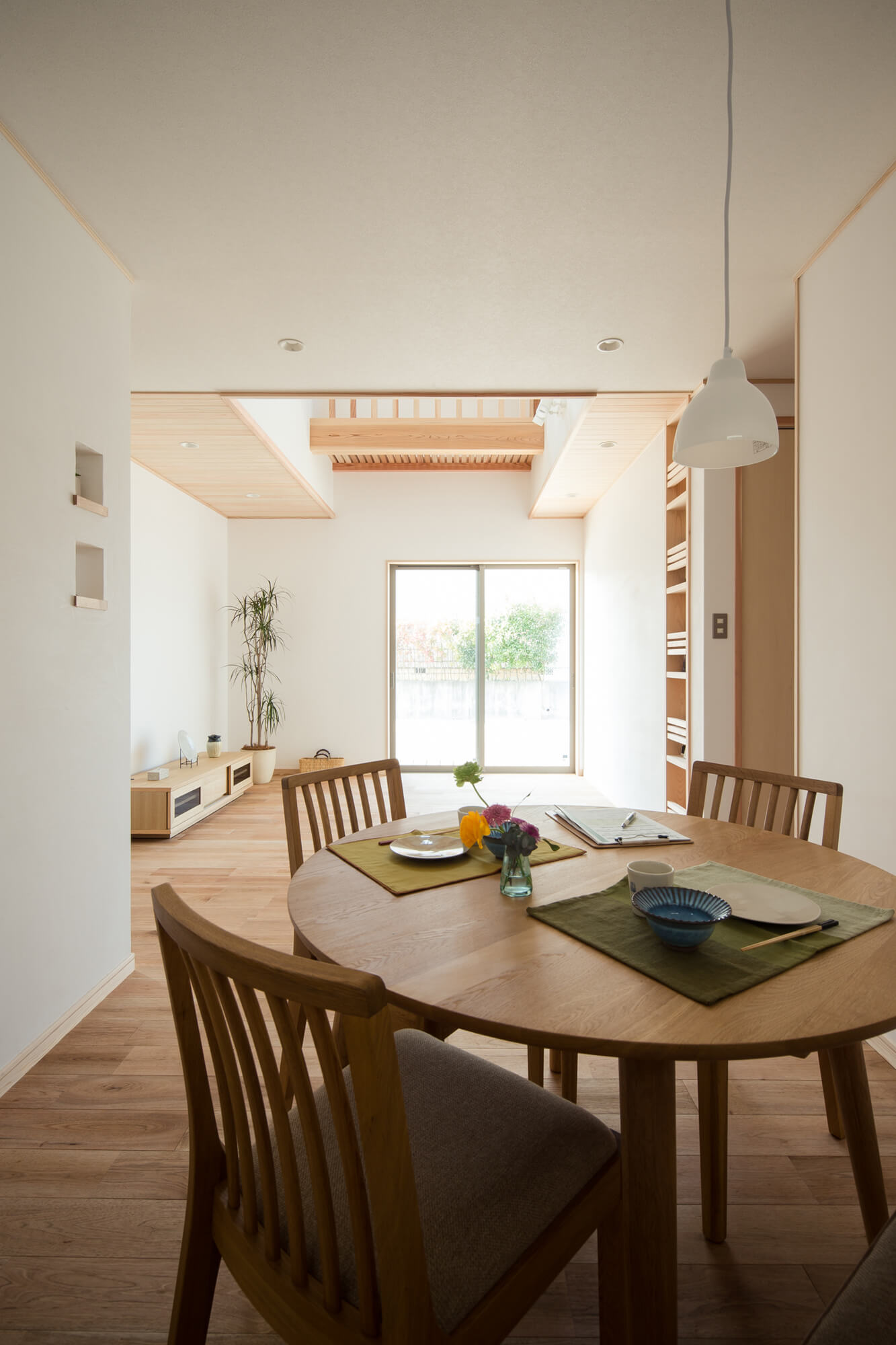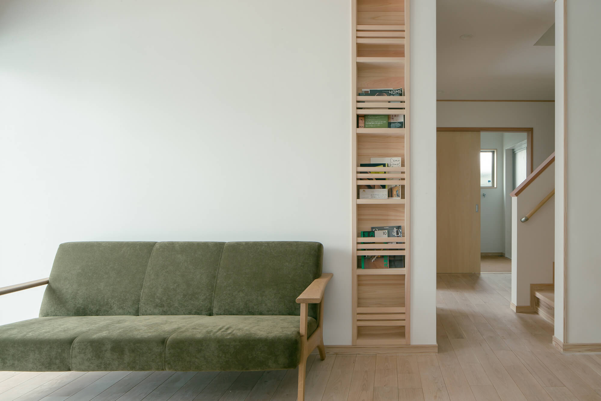 外観から内装に至るまで明確なイメージをお持ちのお施主様でした。そうしたイメージをひとつひとつ打ち合わせの中で確かめながら形にしてゆき、そうして出来上がったのは、深い白色の静謐な印象の家でした。床はクルミ材を使い、壁は漆喰で仕上げました。随所に奥様のお好きな和テイストのシンプルなタイルを使い、建具もシナ材で製作することにより、シンプルで大人っぽい仕上がりになりました。