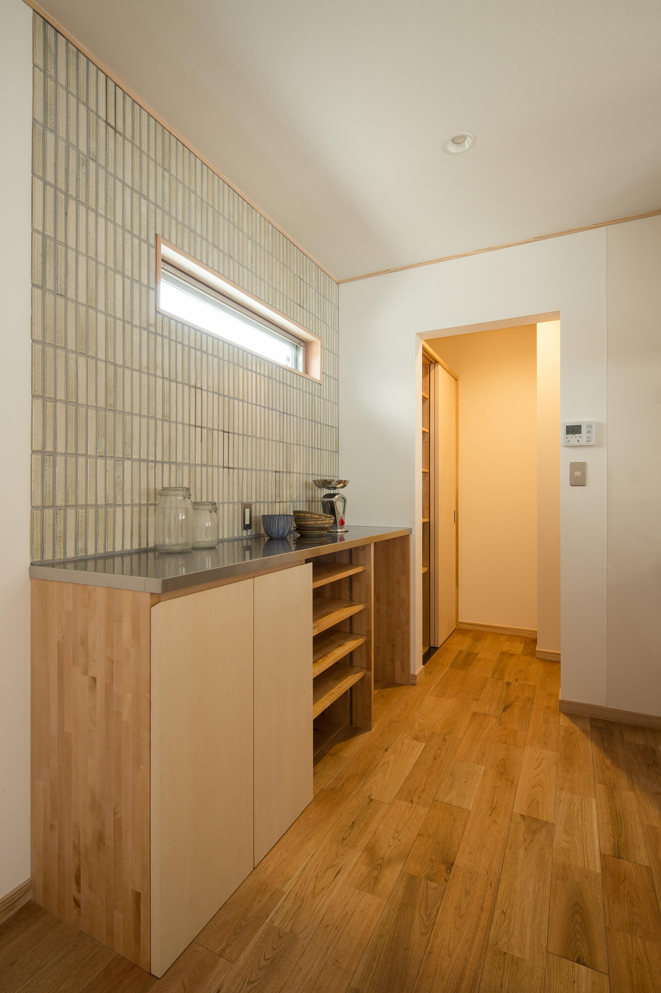 ステンレス天板の持つ素材感と和風のタイルとの組み合わせがおしゃれな造作キッチンカウンターです