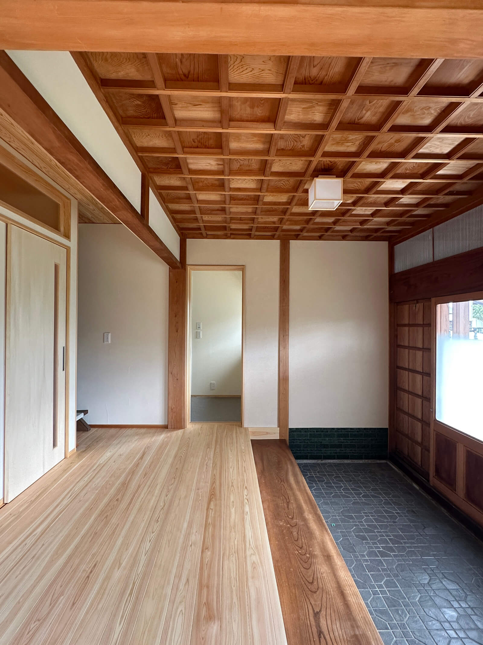 玄関。改修前の格天井や下段板、土間は残しました。壁は白く塗り替え明るい雰囲気に生まれ変わりました。正面に見える開口は洗濯脱衣室につながります。左手の建具を開けるとダイニングにつながります。建具の上は嵌め殺しのガラスとなり、ダイニングへの明かり取りとしています。