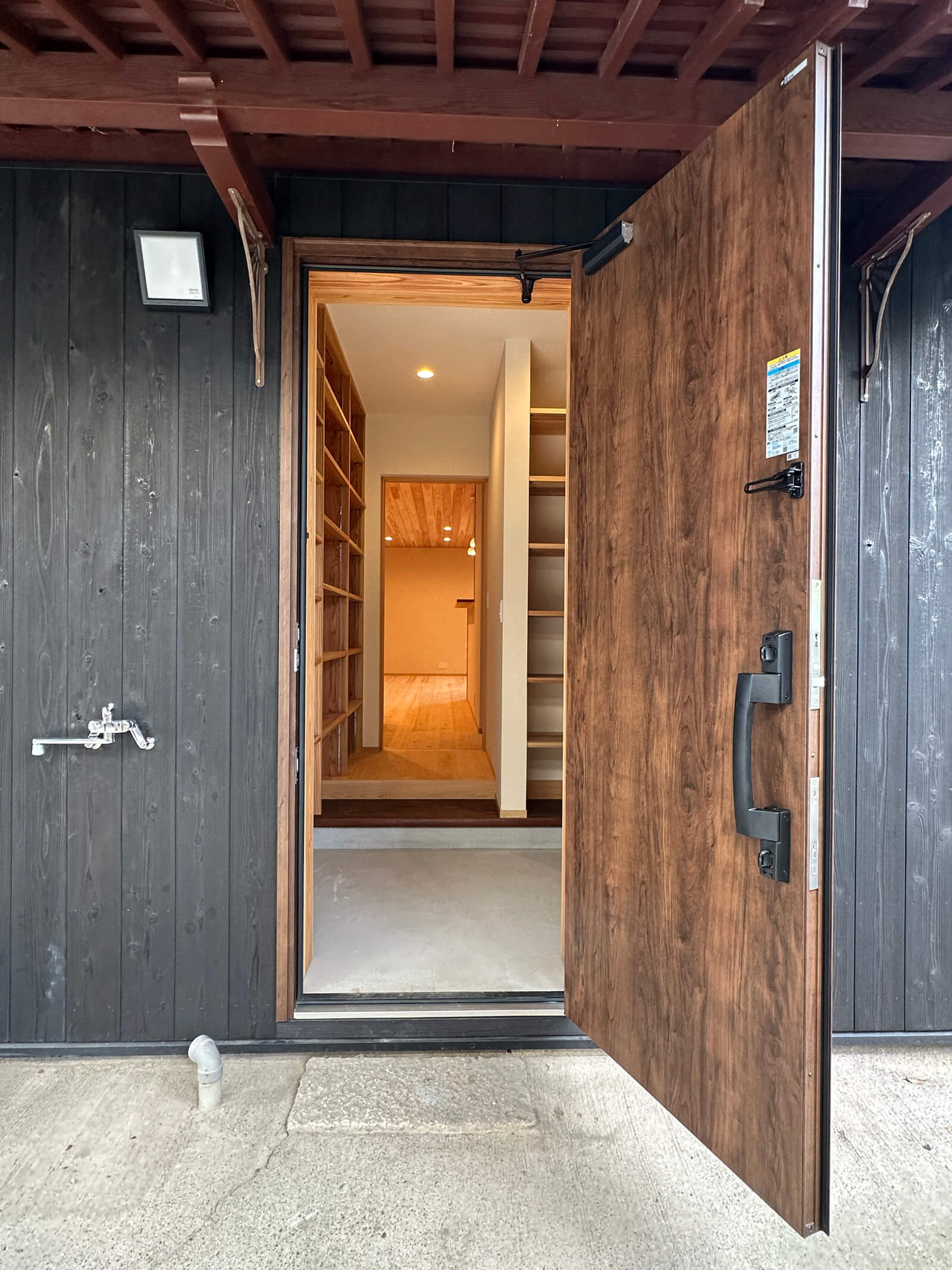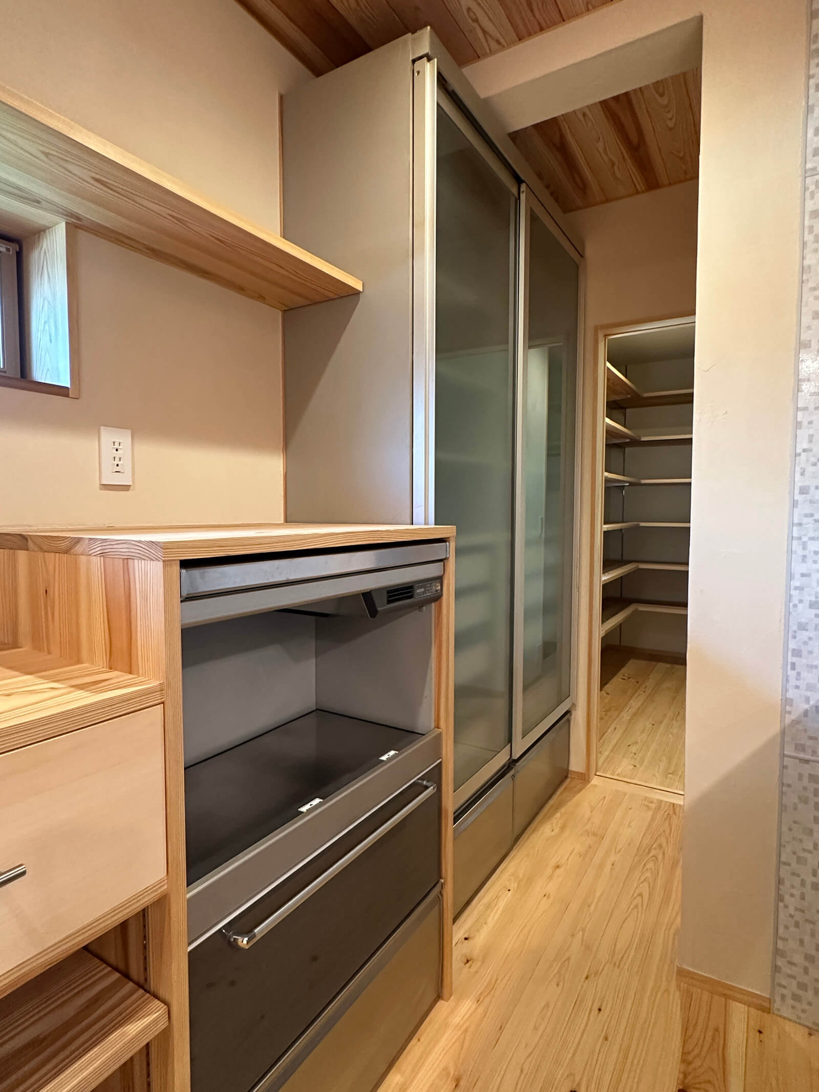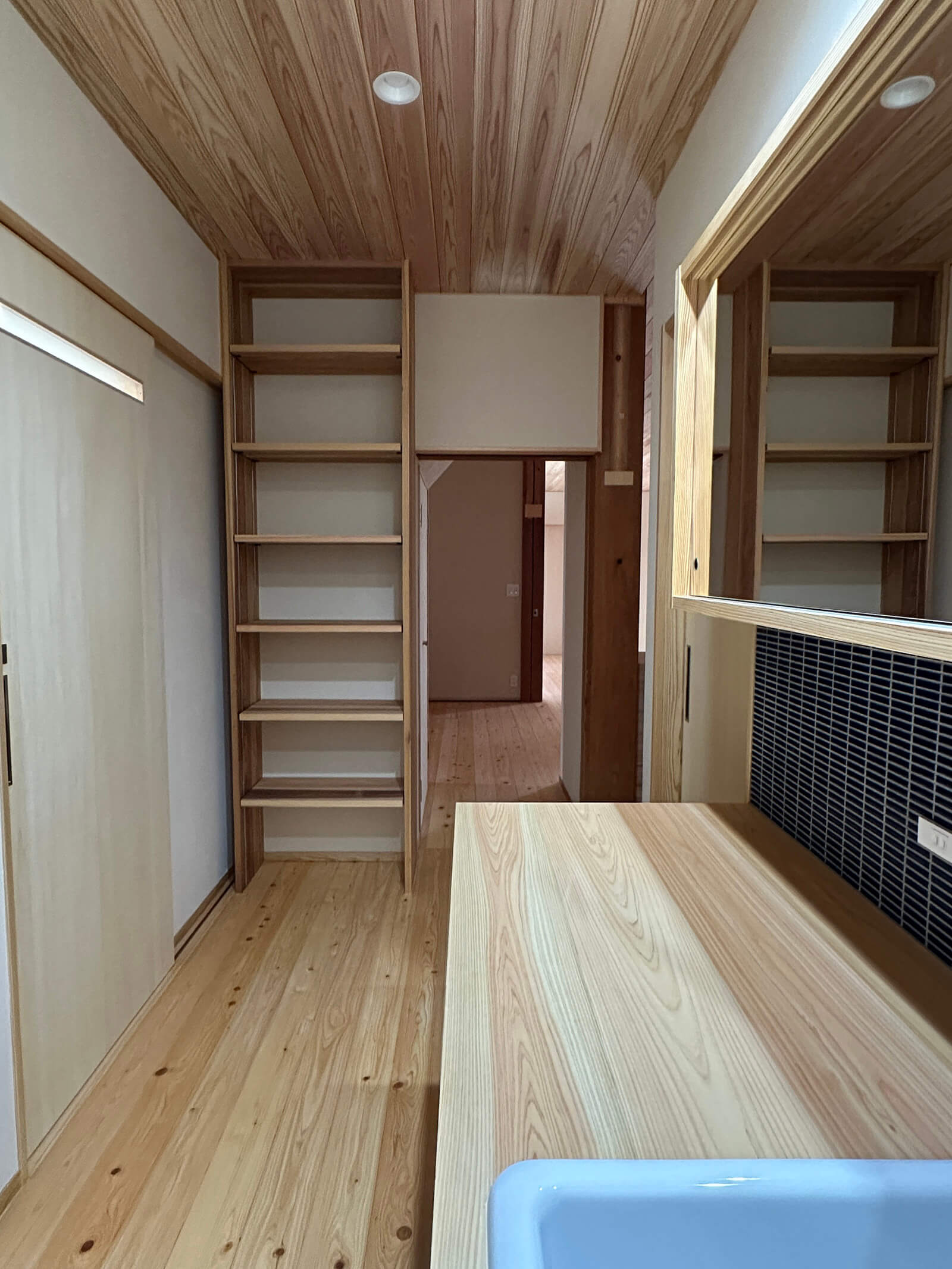 改修前は大きな土間の勝手口兼水まわり兼収納でした。普段の生活ではこちらが家族の出入りになるので、改修後はSICを兼ねる収納としています。勝手口ドアからまっすぐに入るとダイニングに通じています。勝手口ドアを入り右に折れるとパントリーを通ってキッチンへ入れる動線です。