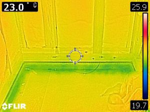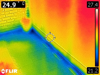壁と土間部分の角部分(すみっこ)だけ青く色がついて、土間の中心部分(画像左下方向)はまた赤くなっています。