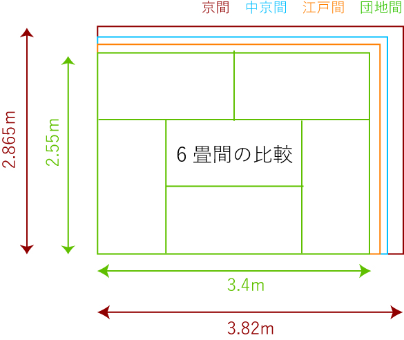これは地方によって畳の大きさが違い、「6帖」といっても、畳が6枚というだけで、面積は全く違います。