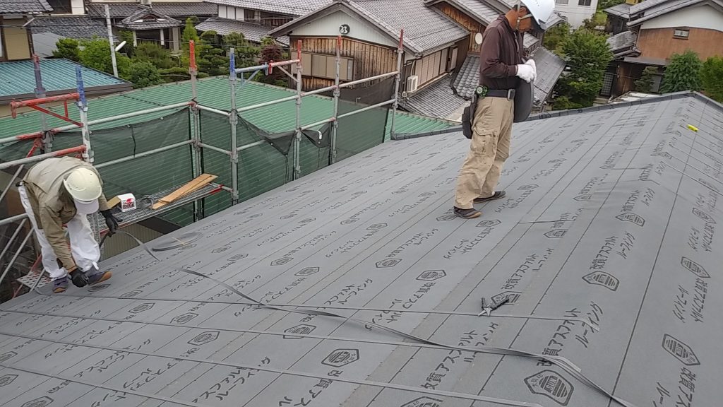 すぐに透湿防水シートを貼る事が出来ると良いのですが、工法や工程によっては1~2週間貼れない場合もありますので、一時的にブルーシートで覆う事が出来ればベストです。