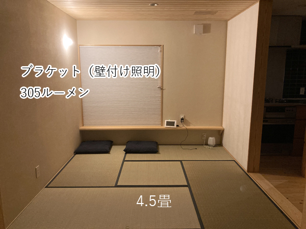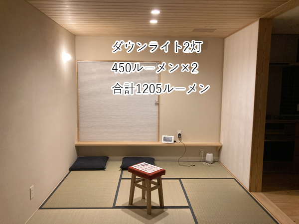 4.5畳の部屋で使用している器具がLED一体型ですから、先ほどの表では2700ルーメン必要とされていますが、こちらではダウンライトとブラケットで合計1205ルーメンになります。
