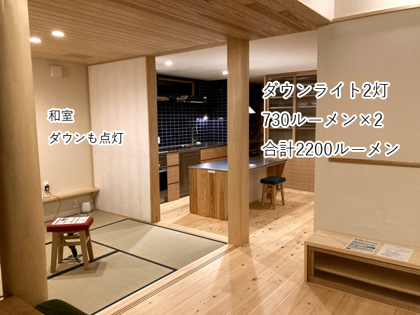 下の写真は上記に加えて、和室・ダイニング共にダウンライトも点灯しています。