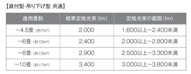 こちらですと1畳あたり340ルーメン~が基準となります。(1室1灯シーリング)