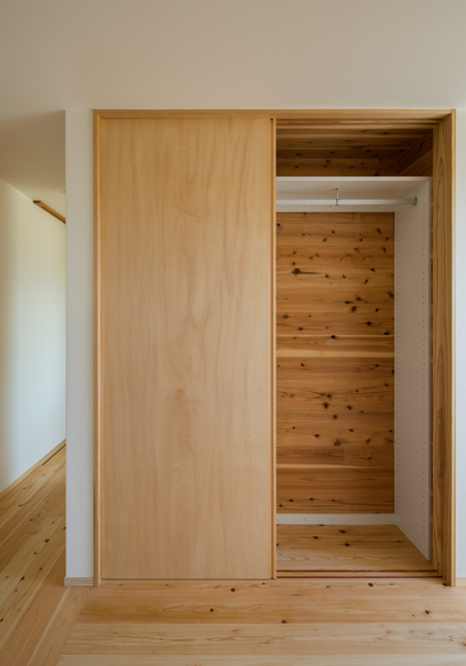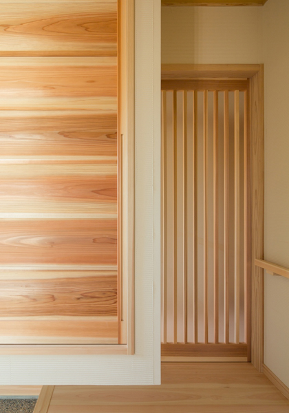 この写真は手前が杉板を横貼りした建具で、奥は細い杉板の間にアクリル板を挟んだ引き戸です