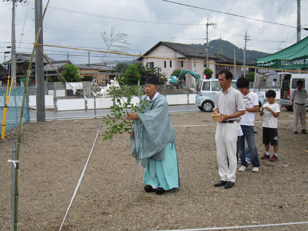 一般的には神式で行うことが多いと思います。(写真も神式です)弊社では仏式も何度か経験しました。調べてみるとキリスト教式というものもあるようです。施主様の宗旨によって変わります。