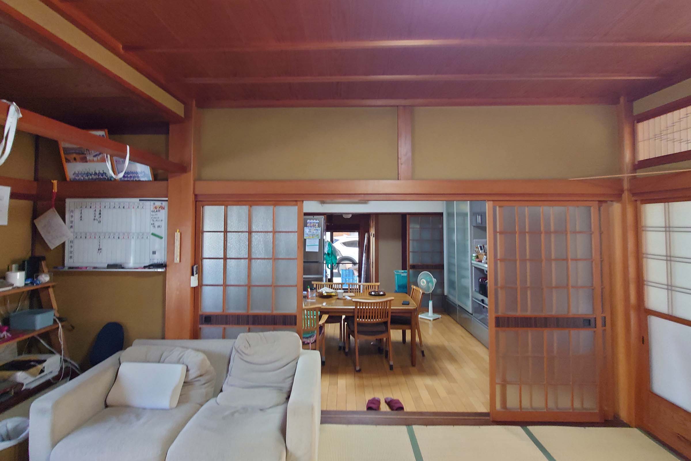 改修後/建具と垂れ壁は撤去し、広かった玄関の一部もダイニングとして取り込んだ間取りです。右手の障子の向こうが大掛かりに改修をしていない出の間になります。改修前/リビングからダイニング方向を見る。