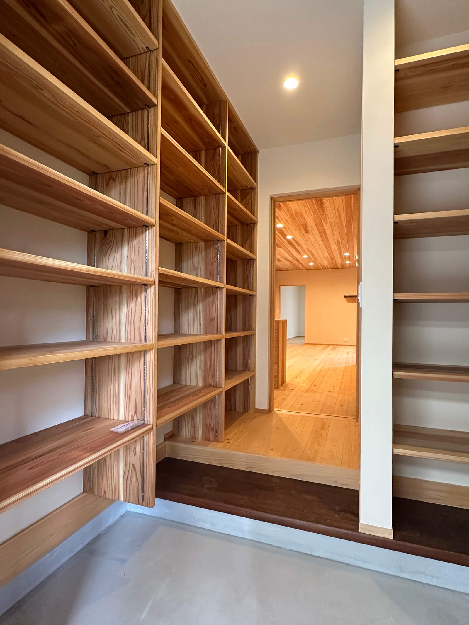 改修前は大きな土間の勝手口兼水まわり兼収納でした。普段の生活ではこちらが家族の出入りになるので、改修後はSICを兼ねる収納としています。勝手口ドアからまっすぐに入るとダイニングに通じています。勝手口ドアを入り右に折れるとパントリーを通ってキッチンへ入れる動線です。